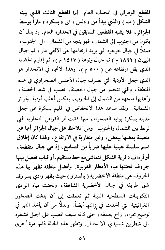 المقطع الوهراني في انحداره العام. أما المقطع الثالث الذي يبينه الشكل (ب) والذي يبدأ من (دلس) الى (بسكره) مارا بوسط الجزائر، فلا يشبه المقطعين السابقين في انحداره العام. إذ بدل أن يكون من الجنوب إلى الشمال، فهو يتجه من الشمال الى الجنوب، فمثلا في جبال جرجره التي يزيد ارتفاعها على الألفي متر، ثم جبال البيبان (1862 م) ثم جبال ونوغة (1417 م)، ثم إقليم الحضنة الذي يقل ارتفاعه عن (500 م)، وهذا الاتجاه في الانحدار هو الذي جعل الأودية التي تصرف جبال الأطلس الصحراوي في هذه المنطقة، والتي تنحدر من جبال الحضنة، تصب في شط الحضنة، وأغلبها متجهة من الشمال إلى الجنوب، بعكس أغلب أودية الجزائر الشمالية. ولقد ساعد هذا الانخفاض في إقليم بسكرة على جعل مدينة بسكرة بوابة الصحراء، منها كانت تمر القوافل التجارية التي تربط بين الشمال والجنوب. ومن الملاحظ على جبال الجزائر أنها غير متصلة بعضها ببعض، وغير متقاربة في الارتفاع، ولهذا كان إطلاق اسم سلسلة جبلية عليها ضربا من التسامح، إذ هي جبال متقطعه، أو أرداف دائرية الشكل تتماشىمع خط مستقيم، أو قباب تفصل بينها جروف نحتتها مياه الأمطار الغزيرة. وأفضل منظفة تظهر بها هذه الجروف هي منطقة الأخضرية (بالسترو) حيث يظهر وادي يسر وقد شق طريقه في جبال الأخضرية الشاهقة، ونحتت مياه الوادي التكوينات السطحية اللينة ثم تعمقت إلى أن بلغت الصخور الغرانيتية التي أخدت في إزالتها أيضا. وبدلا من أن يأخذ النهر في توسيع مجراه، راح يعمقه، حتى كأنه سيف انصب على الجبل فشطره الى شطرين شديدي الانحدار. وتظهر هذه الحالة ذاتها مرة أخرى