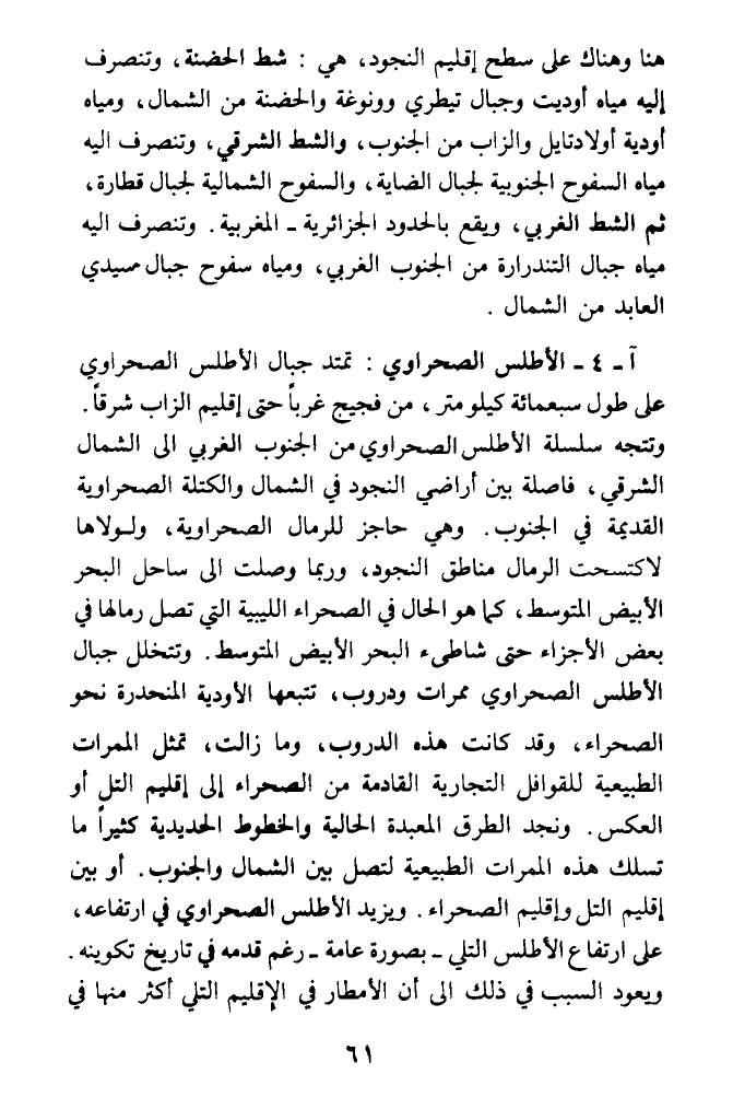 آ -4 - الأطلس الصحراوي: تمتد جبال الأطلس الصحراوي على طول سبعمائة كيلومر، من فجيج غربا حتى إقليم الزاب شرقا. وتتجه سلسلة الأطلس الصحراوي من الجنوب الغربي الى الشمال الشرقي، فاصلة بين أراضي النجود في الشمال والكتلة الصحراوية القديمة في الجنوب. وهي حاجز للرمال الصحراوية، ولولاها لاكتسحت الرمال مناطق النجود، وربما وصلت الى ساحل البحر الأبيض المتوسط، كما هو الحال في الصحراء الليبية التي تصل رمالها في بعض الأجزاء حتى شاطىء البحر الأبيض المتوسط. وتتخلل جبال الأطلس الصحراوي ممرات ودروب، تتبعها الأودية المنحدرة نحو الصحراء، وقد كانت هذه الدروب، وما زالت، تمثل الممرات الطبيعية للقوافل التجارية القادمة من الصحراء إلى إقيلم التل أو العكس. ونجد الطرق المعبدة الحالية والخطوط الحديدية كثيرا ما تسلك هذه الممرات الطبيعية لتصل بين الشمال والجنوب. أو بين إقليم التل وإقليم الصحراء. ويزيد الأطلس الصحراوي في ارتفاعه، عل ارتفاع الأطلس التلي - بصورة عامة - رغم قدمه في تاريخ تكوينه. ويعود السبب في ذلك الى أن الأمطار في الإقليم التلي أكثر منها في