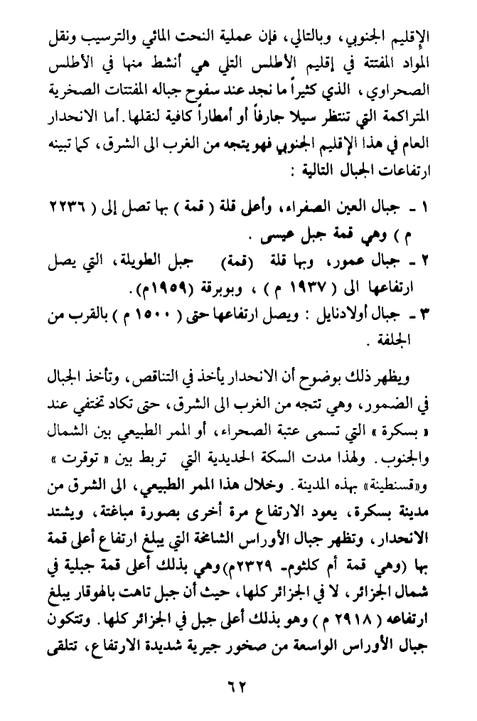 ويظهر ذلك بوضوح أن الانحدار يأخذ في التناقص، وتأخذ الجبال في الضمور، وهي تتجه من الغرب الى الشرق، حتى تكاد تختفي عند (بسكرة) التي تسمى عتبة الصحراء، أو الممر الطبيعي بين الشمال والجنوب. ولهذا مدت السكة الحديدية التي تربط بين (توقرت) و (قسنطينة) بهذه المدينة. وخلال هذا الممر الطبيعي، الى الشرق من مدينة بسكرة، يعود الارتفاع مرة أخرى بصورة مباغتة، ويشتد الانحدار، وتظهر جبال الأوراس الشامخة التي يبلغ ارتفاع أعلى قمة بها (وهي قمة أم كلثوم- 2329م) وهي بذلك أعلى قمة جبلية في شمال الجزائر، لافي الجزائر كلها، حيث أن جبل تاهت بالهوقار يبلغ ارتفاعه (2918م) وهو بذلك أعلى جبل في الجزائر كلها. وتتكون جبال الأوراس الواسعة من صخور جيرية شديدة الارتفاع، تتلقى