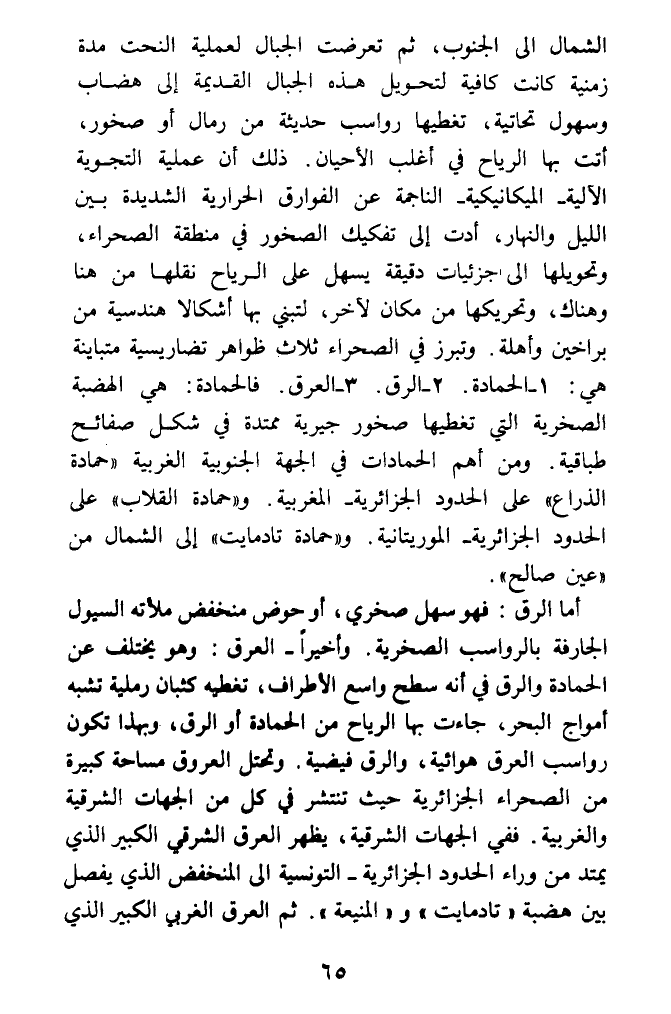 الشمال الى الجنوب، ثم تعرضت الجبال لعملية النحت مدة زمنية كانت كافية لتحويل هذه الجبال القديمة إلى هضاب وسهول تحاتية، تغطيها رواسب حديثة من رمال أو صخور، أتت بها الرياح في أغلب الأحيان. ذلك أن عملية التجوية الآلية- الميكانيكية- الناجمة عن الفوارق الحرارية الشديدة بين الليل والنهار، أدت إلى تفكيك الصخور في منطقة الصحراء، وتحويلها الى جزئيات دقيقة يسهل على الرياح نقلها من هنا وهناك، وتحريكها من مكان لآخر، لتبني بها أشكالا هندسية من براخين وأهلة. وتبرز في الصحراء ثلاث ظواهر تضاريسية متباينة هي: