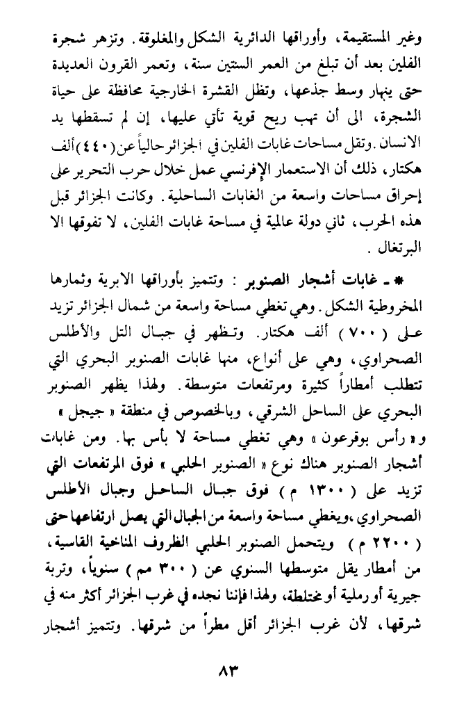 * - غابات أشجار الصنوبر: وتتميز بأوراقها الابرية وثمارها المخروطية الشكل. وهي تغطي مساحة واسعة من شمال الجزائر تزيد على (700) ألف هكتار. وتظهر في جبال التل والأطلس الصحراوي، وهي على أنواع، منها غابات الصنوبر البحري التي تتطلب أمطارا كثيرة ومرتفعات متوسطة. ولهذا يظهر الصنوبر البحري على الساحل الشرقي، وبالخصوص في منطقة (جيجل) و (رأس بوقرعون) وهي تغطي مساحة لا بأس بها. ومن غابات أشجار الصنوبر هناك نوع (الصنوبر الحلبي) فوق المرتفعات التي تزيد على (1300 م) فوق جبال الساحل وجبال الأطلس الصحراوي، ويغطي مساحة واسعة من الجبال التي يصل ارتفاعها حت (2200 م) ويتحمل الصنوبر الحلبي الظروف المناخية القاسية، من أمطار يقل متوسطها السنوي من (300 مم) سنويا، وتربة جيرية أو رملية أو مختلطة، ولهذا فإننا نجده في غرب الجزائر أكثر منه في شرقها، لأن غرب الجزائر أقل مطرا من شرقها. وتتميز أشجار