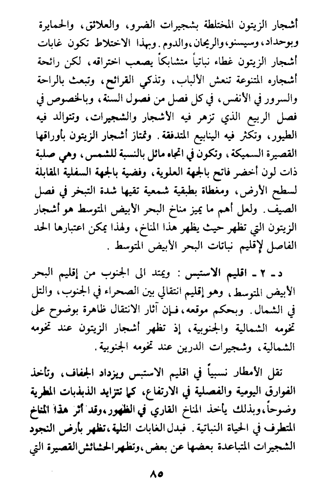 أشجار الزيتون المختلطة بشجيرات الضرو، والعلائق، والحمايرة وبوحداد، وسيسنو، والريحان، والدوم. وبهذا الاختلاط تكون غابات أشجار الزيتون غطاء نباتيا متشابكا يصعب اختراقه، لكن رائحة أشجاره المتنوعة تنعش الألباب، وتذكي القرائح، وتبعث بالراحة والسرور في الأنفس، في كل فصل من فصول السنة، وبالخصوص في فصل الربيع الذي تزهر فيه الأشجار والشجيرات، وتتوالد فيه الطيور، وتكثر فيه الينابيع المتدفقة. وتمتاز أشجار الزيتون بأوراقها القصيرة السميكة، وتكون في اتجاه مائل بالنسبة للشمس، وهي صلبة ذات لون أخضر فاتح بالجهة العلوية، وفضية بالجهة السفلية المقابلة لسطح الأرض، ومغطاة بطبقية شمعية تقيها شدة التبخر في فصل الصيف. ولعل أهم ما يميز مناخ البحر الأبيض المتوسط هو أشجار الزيتون التي تظهر حيث يظهر هذا المناخ، ولهذا يمكن اعتبارها الحد الفاصل لإقليم نباتات البحر الأبيض المتوسط.