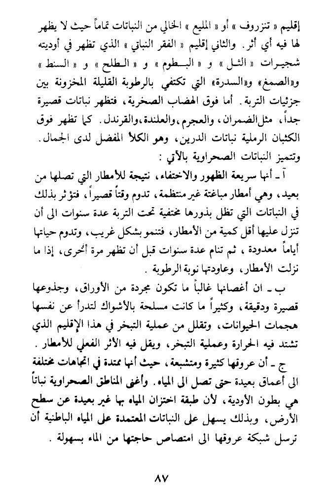 آ - أنها سريعة الظهور والاختفاء، نتيجة للأمطار التي تصلها من بعيد، وهي أمطار مباغتة غير منتظمة، تدوم وقتا قصيرا، فتؤثر بذلك في النباتات التي تظل بذورها مختفية تحت التربة عدة سنوات الى أن تنزل عليها أقل كمية من الأمطار، فتنمو بشكل غريب، وتدوم حياتها أياما معدودة، ثم تنام عدة سنوات قبل أن تظهر مرة أخرى، إذا ما نزلت الأمطار، وعاودنا نوبة الرطوبة.