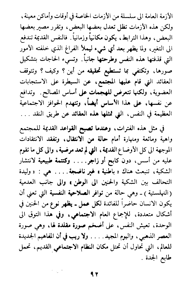 الأزمة العامة الى سلسلة من الأزمات الخاصة في أوقات وأماكن معينة، ولكن هذه الأزمات تظل تعدل بعضها البعض، وتقرر مصير بعضها البعض، وهذا الترابط، يكون مكانيا وزمانيا. فالنفس القديمة تندفع الى التغير، ولما يظهر بعد أي شيء ليملأ الفراغ الذي خلفته الأمور التي قذفتها هذه النفس وطرحتها جانبا. وتسيء الحاجات بتشكيل صورها، وتكتفي بما تستطيع تحقيقه من أين؟ وكيف؟ وتتوقف العقائد التي قام عليها المجتمع، عن السيطرة على الاستجابات العضوية، ولكنها تتعرض للهجمات على أساس المصالح. وتدافع عن نفسها، على هذا الأساس أيضا، وتتهدم الحوافز الاجتماعية العظيمة في النفس، التي تمثلها هذه العقائد عن طريق النقد ...