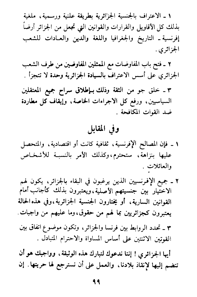 1 - الاعتراف بالجنسية الجزائرية بطريقة علنية ورسمية، ملغية بذلك كل الأقاويل والقرارات والقوانين التي تجعل من الجزائر أرضا إفرنسية - التاريخ والجغرافيا واللغة والدين والعادات للشعب الجزائري.