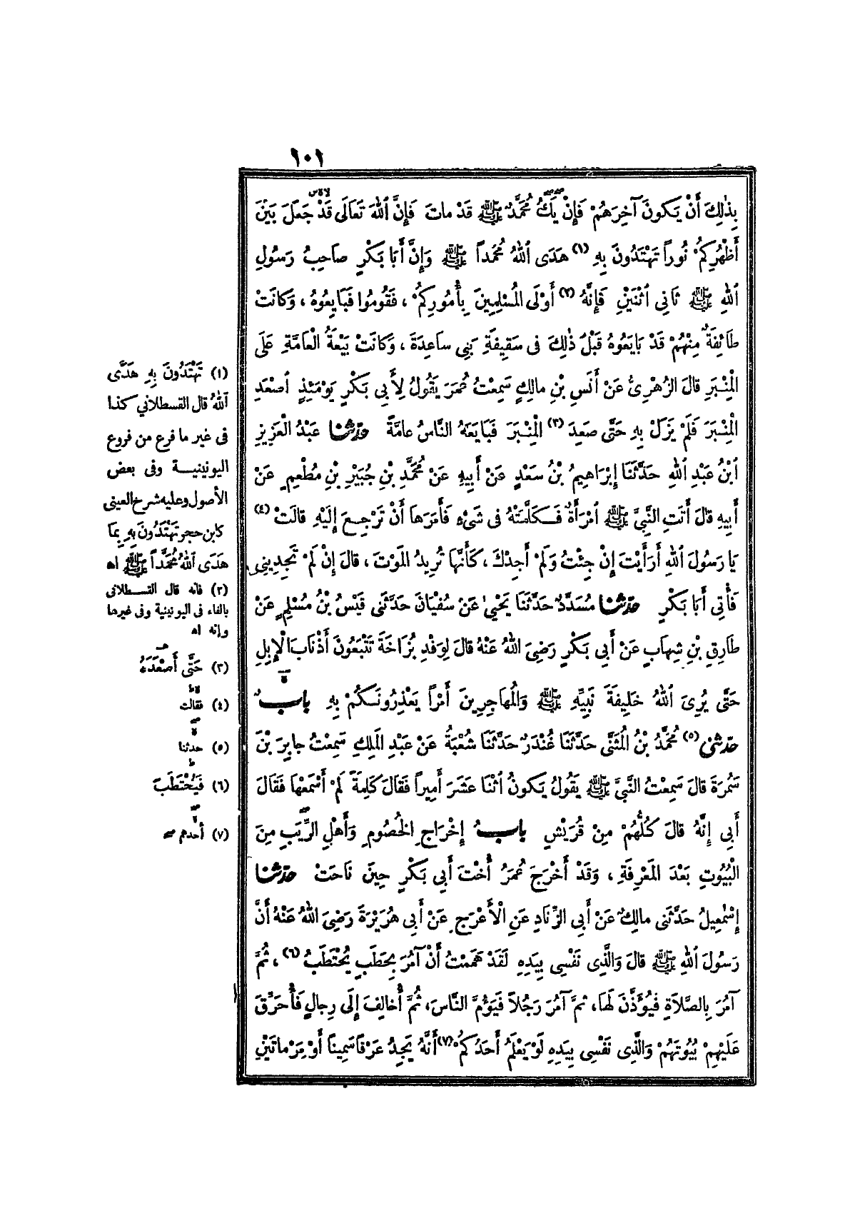 7221- حَدَّثَنَا مُسَدَّدٌ ، حَدَّثَنَا يَحْيَى ، عَنْ سُفْيَانَ ، حَدَّثَنِي قَيْسُ بْنُ مُسْلِمٍ ، عَنْ طَارِقِ بْنِ شِهَابٍ ، عَنْ أَبِي بَكْرٍ ، رَضِيَ اللَّهُ عَنْهُ ، قَالَ لِوَفْدِ بُزَاخَةَ : تَتْبَعُونَ أَذْنَابَ الإِبِلِ ، حَتَّى يُرِيَ اللَّهُ خَلِيفَةَ نَبِيِّهِ صَلَّى اللَّهُ عَلَيْهِ وَسَلَّمَ وَالمُهَاجِرِينَ أَمْرًا يَعْذِرُونَكُمْ بِهِ.