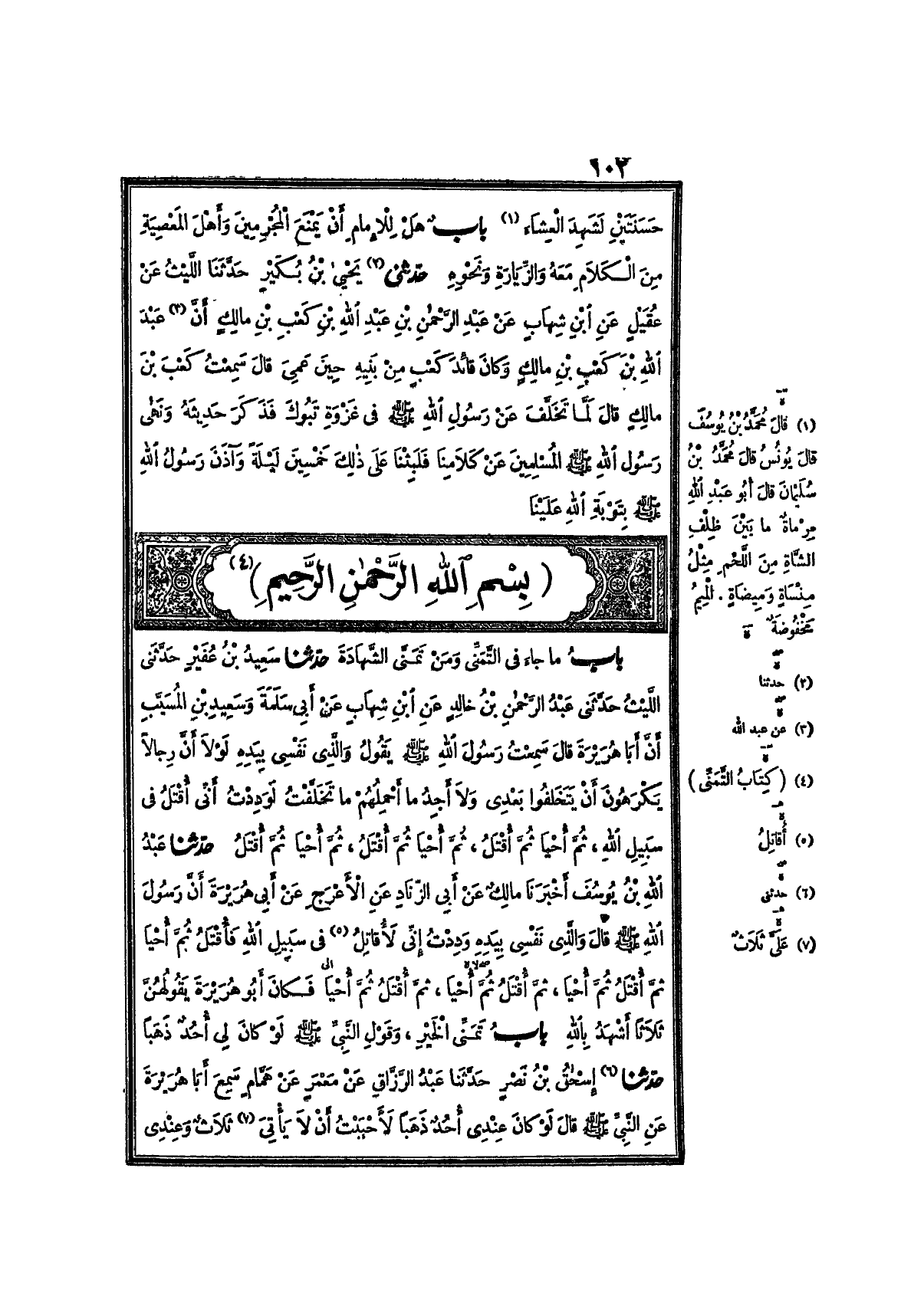 7226 - حَدَّثَنَا سَعِيدُ بْنُ عُفَيْرٍ، حَدَّثَنِي اللَّيْثُ، حَدَّثَنِي عَبْدُ الرَّحْمَنِ بْنُ خَالِدٍ، عَنِ ابْنِ شِهَابٍ، عَنْ أَبِي سَلَمَةَ، وَسَعِيدِ بْنِ الْمُسَيَّبِ، أَنَّ أَبَا هُرَيْرَةَ قَالَ: سَمِعْتُ رَسُولَ اللهِ صَلَّى اللَّهُ عَلَيْهِ وَسَلَّمَ يَقُولُ: وَالَّذِي نَفْسِي بِيَدِهِ، لَوْلاَ أَنَّ رِجَالاً يَكْرَهُونَ أَنْ يَتَخَلَّفُوا بَعْدِي، وَلاَ أَجِدُ مَا أَحْمِلُهُمْ، مَا تَخَلَّفْتُ، لَوَدِدْتُ أَنِّي أُقْتَلُ فِي سَبِيلِ اللهِ، ثُمَّ أُحْيَا، ثُمَّ أُقْتَلُ، ثُمَّ أُحْيَا، ثُمَّ أُقْتَلُ، ثُمَّ أُحْيَا، ثُمَّ أُقْتَلُ.