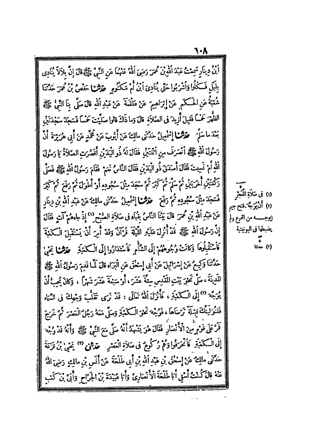 7251- حَدَّثَنَا إِسْمَاعِيلُ ، حَدَّثَنِي مَالِكٌ ، عَنْ عَبْدِ اللهِ بْنِ دِينَارٍ ، عَنْ عَبْدِ اللهِ بْنِ عُمَرَ ، قَالَ : بَيْنَا النَّاسُ بِقُبَاءٍ فِي صَلاَةِ الصُّبْحِ ، إِذْ جَاءَهُمْ آتٍ , فَقَالَ : إِنَّ رَسُولَ اللهِ صَلَّى اللَّهُ عَلَيْهِ وَسَلَّمَ قَدْ أُنْزِلَ عَلَيْهِ اللَّيْلَةَ قُرْآنٌ , وَقَدْ أُمِرَ أَنْ يَسْتَقْبِلَ الكَعْبَةَ فَاسْتَقْبِلُوهَا ، وَكَانَتْ وُجُوهُهُمْ إِلَى الشَّامِ , فَاسْتَدَارُوا إِلَى الكَعْبَةِ.