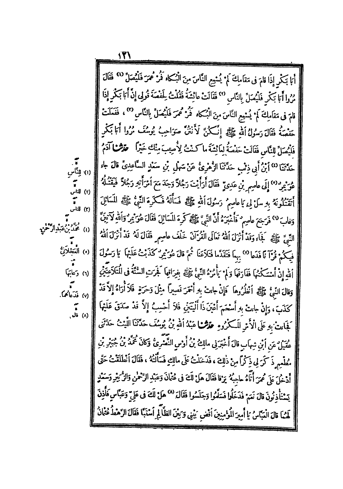 7305- حَدَّثَنَا عَبْدُ اللهِ بْنُ يُوسُفَ ، حَدَّثَنَا اللَّيْثُ ، حَدَّثَنِي عُقَيْلٌ ، عَنِ ابْنِ شِهَابٍ ، قَالَ : أَخْبَرَنِي مَالِكُ بْنُ أَوْسٍ النَّصْرِيُّ ، وَكَانَ مُحَمَّدُ بْنُ جُبَيْرِ بْنِ مُطْعِمٍ ذَكَرَ لِي ذِكْرًا مِنْ ذَلِكَ ، فَدَخَلْتُ عَلَى مَالِكٍ فَسَأَلْتُهُ ، فَقَالَ : انْطَلَقْتُ حَتَّى أَدْخُلَ عَلَى عُمَرَ , أَتَاهُ حَاجِبُهُ يَرْفَأُ ، فَقَالَ : هَلْ لَكَ فِي عُثْمَانَ ، وَعَبْدِ الرَّحْمَنِ ، وَالزُّبَيْرِ ، وَسَعْدٍ يَسْتَأْذِنُونَ ؟ قَالَ : نَعَمْ ، فَدَخَلُوا فَسَلَّمُوا وَجَلَسُوا ، فَقَالَ : هَلْ لَكَ فِي عَلِيٍّ ، وَعَبَّاسٍ ؟ فَأَذِنَ لَهُمَا ، قَالَ العَبَّاسُ : يَا أَمِيرَ المُؤْمِنِينَ ، اقْضِ بَيْنِي وَبَيْنَ الظَّالِمِ اسْتَبَّا ، فَقَالَ الرَّهْطُ : عُثْمَانُ وَأَصْحَابُهُ : يَا أَمِيرَ المُؤْمِنِينَ , اقْضِ بَيْنَهُمَا ، وَأَرِحْ أَحَدَهُمَا مِنَ الآخَرِ ، فَقَالَ : اتَّئِدُوا ، أَنْشُدُكُمْ بِاللهِ الَّذِي بِإِذْنِهِ تَقُومُ السَّمَاءُ وَالأَرْضُ ، هَلْ تَعْلَمُونَ أَنَّ رَسُولَ اللهِ صَلَّى اللَّهُ عَلَيْهِ وَسَلَّمَ قَالَ : لاَ نُورَثُ , مَا تَرَكْنَا صَدَقَةٌ , يُرِيدُ رَسُولُ اللهِ صَلَّى اللَّهُ عَلَيْهِ وَسَلَّمَ نَفْسَهُ ؟ قَالَ الرَّهْطُ : قَالَ ذَلِكَ ، فَأَقْبَلَ عُمَرُ عَلَى عَلِيٍّ ، وَعَبَّاسٍ , فَقَالَ : أَنْشُدُكُمَا بِاللهِ , هَلْ تَعْلَمَانِ أَنَّ رَسُولَ اللهِ صَلَّى اللَّهُ عَلَيْهِ وَسَلَّمَ قَالَ ذَلِكَ ؟ قَالاَ : نَعَمْ ،