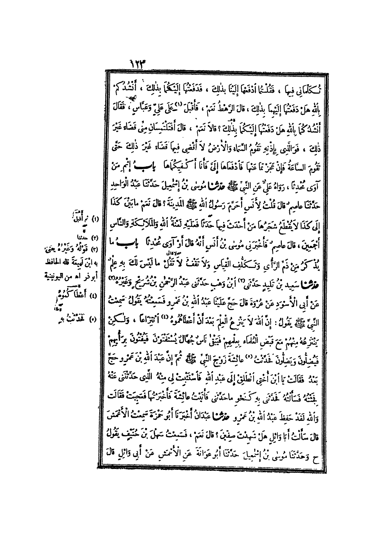 7307- حَدَّثَنَا سَعِيدُ بْنُ تَلِيدٍ ، حَدَّثَنِي ابْنُ وَهْبٍ ، حَدَّثَنِي عَبْدُ الرَّحْمَنِ بْنُ شُرَيْحٍ ، وَغَيْرُهُ عَنْ أَبِي الأَسْوَدِ ، عَنْ عُرْوَةَ ، قَالَ : حَجَّ عَلَيْنَا عَبْدُ اللهِ بْنُ عَمْرٍو , فَسَمِعْتُهُ يَقُولُ : سَمِعْتُ النَّبِيَّ صَلَّى اللَّهُ عَلَيْهِ وَسَلَّمَ يَقُولُ : إِنَّ اللَّهَ لاَ يَنْزِعُ العِلْمَ بَعْدَ أَنْ أَعْطَاكُمُوهُ انْتِزَاعًا ، وَلَكِنْ يَنْتَزِعُهُ مِنْهُمْ , مَعَ قَبْضِ العُلَمَاءِ بِعِلْمِهِمْ ، فَيَبْقَى نَاسٌ جُهَّالٌ ، يُسْتَفْتَوْنَ فَيُفْتُونَ بِرَأْيِهِمْ ، فَيُضِلُّونَ وَيَضِلُّونَ ، فَحَدَّثْتُ بِهِ عَائِشَةَ , زَوْجَ النَّبِيِّ صَلَّى اللَّهُ عَلَيْهِ وَسَلَّمَ ، ثُمَّ إِنَّ عَبْدَ اللهِ بْنَ عَمْرٍو حَجَّ بَعْدُ , فَقَالَتْ : يَا ابْنَ أُخْتِي , انْطَلِقْ إِلَى عَبْدِ اللهِ , فَاسْتَثْبِتْ لِي مِنْهُ الَّذِي حَدَّثْتَنِي عَنْهُ ، فَجِئْتُهُ فَسَأَلْتُهُ , فَحَدَّثَنِي بِهِ كَنَحْوِ مَا حَدَّثَنِي ، فَأَتَيْتُ عَائِشَةَ فَأَخْبَرْتُهَا فَعَجِبَتْ , فَقَالَتْ : وَاللهِ لَقَدْ حَفِظَ عَبْدُ اللهِ بْنُ عَمْرٍو.