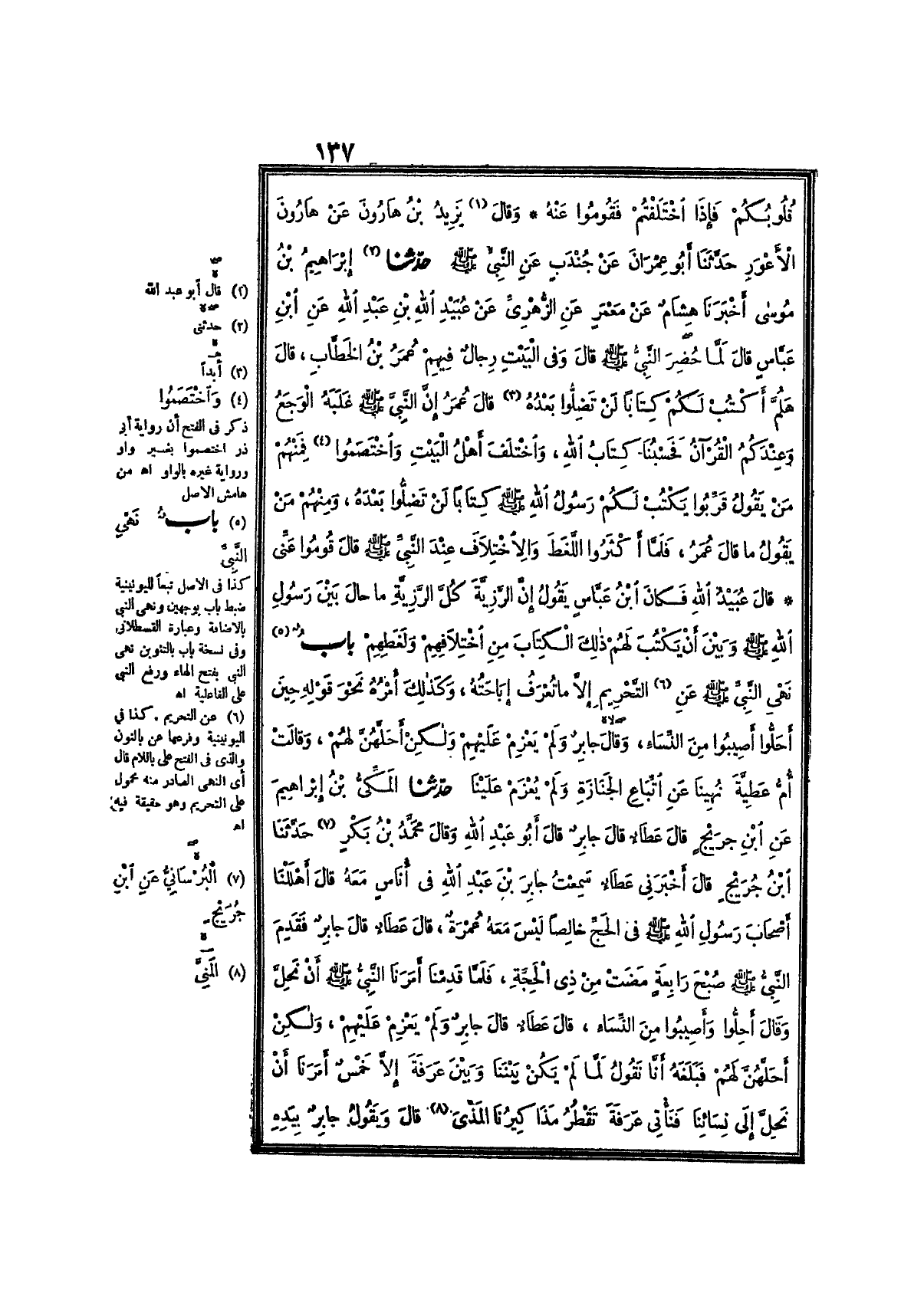 7367- حَدَّثَنَا المَكِّيُّ بْنُ إِبْرَاهِيمَ ، عَنِ ابْنِ جُرَيْجٍ ، قَالَ عَطَاءٌ : وَقَالَ جَابِرٌ (ح) قَالَ أَبُو عَبْدِ اللهِ (1): وَقَالَ مُحَمَّدُ بْنُ بَكْرٍ ، حَدَّثَنَا ابْنُ جُرَيْجٍ ، قَالَ : أَخْبَرَنِي عَطَاءٌ ، سَمِعْتُ جَابِرَ بْنَ عَبْدِ اللهِ , فِي أُنَاسٍ مَعَهُ قَالَ : أَهْلَلْنَا أَصْحَابَ رَسُولِ اللهِ صَلَّى اللَّهُ عَلَيْهِ وَسَلَّمَ فِي الحَجِّ خَالِصًا , لَيْسَ مَعَهُ عُمْرَةٌ ، قَالَ عَطَاءٌ : قَالَ جَابِرٌ : فَقَدِمَ النَّبِيُّ صَلَّى اللَّهُ عَلَيْهِ وَسَلَّمَ صُبْحَ رَابِعَةٍ مَضَتْ مِنْ ذِي الحِجَّةِ ، فَلَمَّا قَدِمْنَا أَمَرَنَا النَّبِيُّ صَلَّى اللَّهُ عَلَيْهِ وَسَلَّمَ أَنْ نَحِلَّ ، وَقَالَ : أَحِلُّوا وَأَصِيبُوا مِنَ النِّسَاءِ ، قَالَ عَطَاءٌ : قَالَ جَابِرٌ : وَلَمْ يَعْزِمْ عَلَيْهِمْ ، وَلَكِنْ أَحَلَّهُنَّ لَهُمْ ، فَبَلَغَهُ أَنَّا نَقُولُ : لَمَّا لَمْ يَكُنْ بَيْنَنَا وَبَيْنَ عَرَفَةَ إِلاَّ خَمْسٌ ، أَمَرَنَا أَنْ نَحِلَّ إِلَى نِسَائِنَا ، فَنَأْتِي عَرَفَةَ تَقْطُرُ مَذَاكِيرُنَا المَذْيَ ، قَالَ : وَيَقُولُ جَابِرٌ بِيَدِهِ هَكَذَا وَحَرَّكَهَا ، فَقَامَ رَسُولُ اللهِ صَلَّى اللَّهُ عَلَيْهِ وَسَلَّمَ , فَقَالَ : قَدْ عَلِمْتُمْ أَنِّي أَتْقَاكُمْ لِلَّهِ وَأَصْدَقُكُمْ وَأَبَرُّكُمْ ، وَلَوْلاَ هَدْيِي لَحَلَلْتُ كَمَا تَحِلُّونَ ، فَحِلُّوا ، فَلَوِ اسْتَقْبَلْتُ مِنْ أَمْرِي مَا اسْتَدْبَرْتُ مَا أَهْدَيْتُ ، فَحَلَلْنَا وَسَمِعْنَا وَأَطَعْنَا.