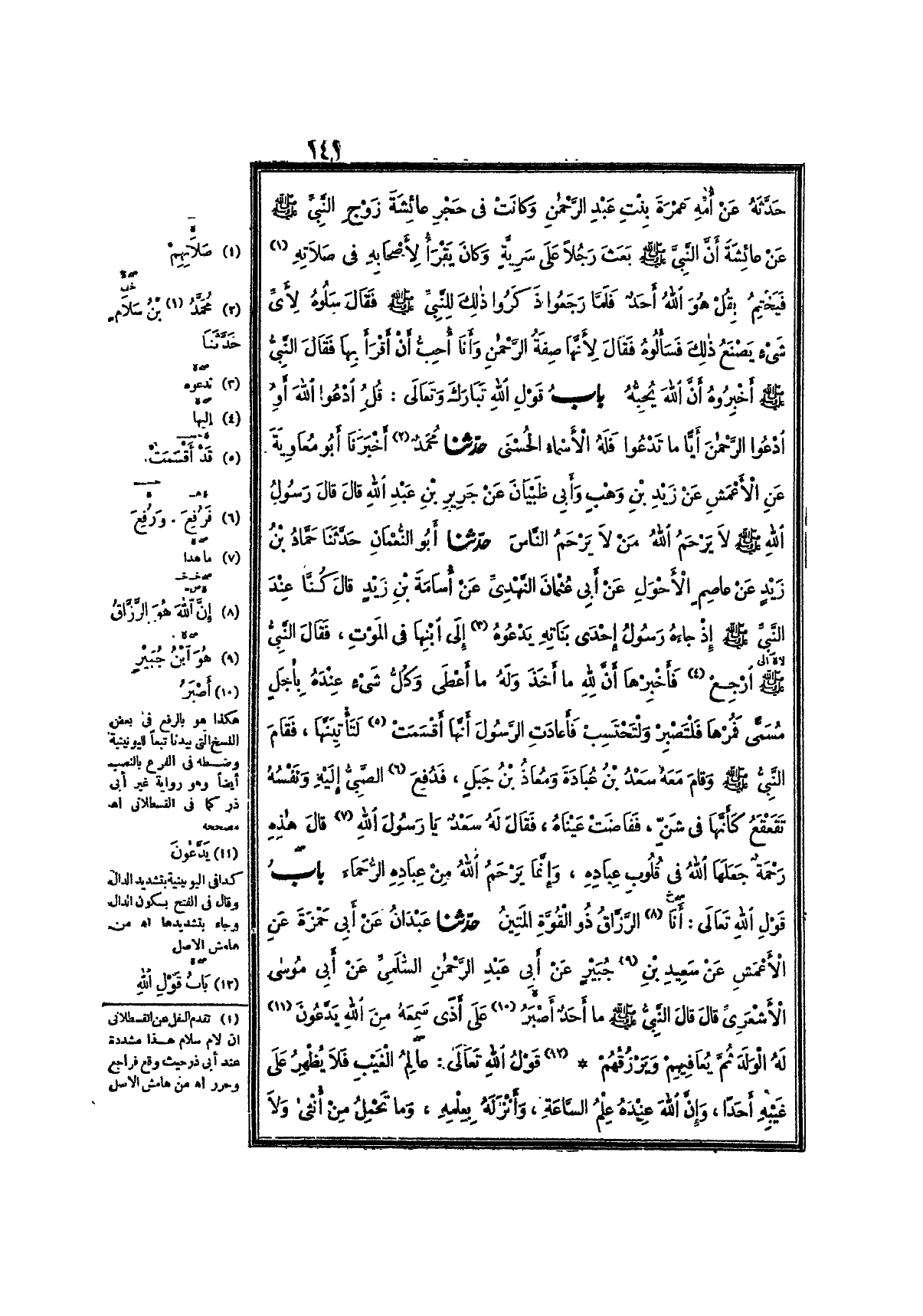 7377- حَدَّثَنَا أَبُو النُّعْمَانِ ، حَدَّثَنَا حَمَّادُ بْنُ زَيْدٍ ، عَنْ عَاصِمٍ الأَحْوَلِ ، عَنْ أَبِي عُثْمَانَ النَّهْدِيِّ ، عَنْ أُسَامَةَ بْنِ زَيْدٍ ، قَالَ : كُنَّا عِنْدَ النَّبِيِّ صَلَّى اللَّهُ عَلَيْهِ وَسَلَّمَ , إِذْ جَاءَهُ رَسُولُ إِحْدَى بَنَاتِهِ ، تَدْعُوهُ إِلَى ابْنِهَا فِي المَوْتِ ، فَقَالَ النَّبِيُّ صَلَّى اللَّهُ عَلَيْهِ وَسَلَّمَ : ارْجِعْ فَأَخْبِرْهَا أَنَّ لِلَّهِ مَا أَخَذَ وَلَهُ مَا أَعْطَى ، وَكُلُّ شَيْءٍ عِنْدَهُ بِأَجَلٍ مُسَمًّى ، فَمُرْهَا فَلْتَصْبِرْ وَلْتَحْتَسِبْ ، فَأَعَادَتِ الرَّسُولَ , أَنَّهَا قَدْ أَقْسَمَتْ لَيَأْتِيَنَّهَا ، فَقَامَ النَّبِيُّ صَلَّى اللَّهُ عَلَيْهِ وَسَلَّمَ وَقَامَ مَعَهُ سَعْدُ بْنُ عُبَادَةَ ، وَمُعَاذُ بْنُ جَبَلٍ ، فَدُفِعَ الصَّبِيُّ إِلَيْهِ وَنَفْسُهُ تَقَعْقَعُ , كَأَنَّهَا فِي شَنٍّ ، فَفَاضَتْ عَيْنَاهُ ، فَقَالَ لَهُ سَعْدٌ : يَا رَسُولَ اللهِ , مَا هَذَا ؟ قَالَ : هَذِهِ رَحْمَةٌ جَعَلَهَا اللَّهُ فِي قُلُوبِ عِبَادِهِ ، وَإِنَّمَا يَرْحَمُ اللَّهُ مِنْ عِبَادِهِ الرُّحَمَاءَ.