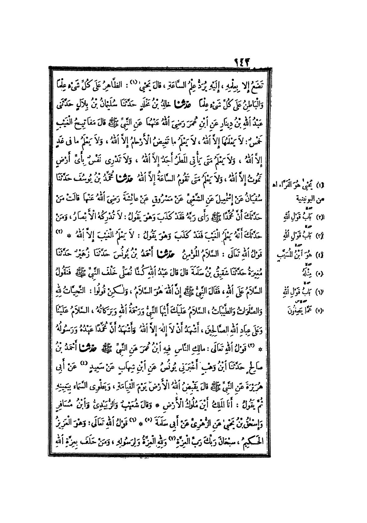 وَ {إِنَّ اللَّهَ عِنْدَهُ عِلْمُ السَّاعَةِ} ، وَ {أَنْزَلَهُ بِعِلْمِهِ} ، {وَمَا تَحْمِلُ مِنْ أُنْثَى وَلاَ تَضَعُ إِلاَّ بِعِلْمِهِ} ، {إِلَيْهِ يُرَدُّ عِلْمُ السَّاعَةِ}.