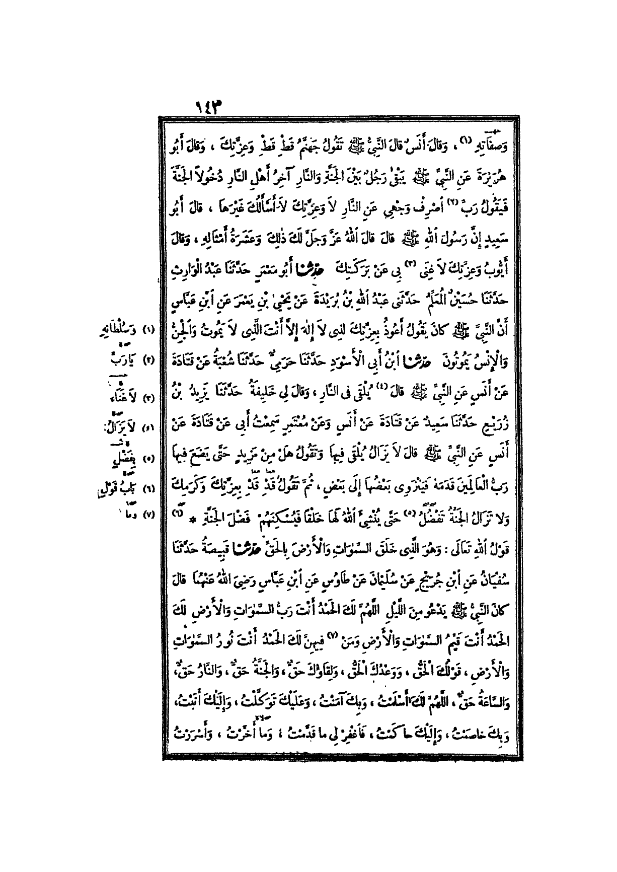 7383- حَدَّثَنَا أَبُو مَعْمَرٍ ، حَدَّثَنَا عَبْدُ الوَارِثِ ، حَدَّثَنَا حُسَيْنٌ المُعَلِّمُ ، حَدَّثَنِي عَبْدُ اللهِ بْنُ بُرَيْدَةَ ، عَنْ يَحْيَى بْنِ يَعْمَرَ ، عَنِ ابْنِ عَبَّاسٍ ؛ أَنَّ النَّبِيَّ صَلَّى اللَّهُ عَلَيْهِ وَسَلَّمَ كَانَ يَقُولُ : أَعُوذُ بِعِزَّتِكَ الَّذِي لاَ إِلَهَ إِلاَّ أَنْتَ , الَّذِي لاَ يَمُوتُ ، وَالجِنُّ وَالإِنْسُ يَمُوتُونَ.