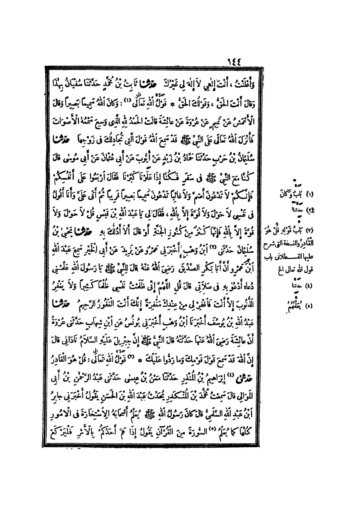 7386- حَدَّثَنَا سُلَيْمَانُ بْنُ حَرْبٍ ، حَدَّثَنَا حَمَّادُ بْنُ زَيْدٍ ، عَنْ أَيُّوبَ ، عَنْ أَبِي عُثْمَانَ ، عَنْ أَبِي مُوسَى ، قَالَ : كُنَّا مَعَ النَّبِيِّ صَلَّى اللَّهُ عَلَيْهِ وَسَلَّمَ فِي سَفَرٍ ، فَكُنَّا إِذَا عَلَوْنَا كَبَّرْنَا ، فَقَالَ : ارْبَعُوا عَلَى أَنْفُسِكُمْ ، فَإِنَّكُمْ لاَ تَدْعُونَ أَصَمَّ ، وَلاَ غَائِبًا ، تَدْعُونَ سَمِيعًا بَصِيرًا قَرِيبًا ، ثُمَّ أَتَى عَلَيَّ , وَأَنَا أَقُولُ فِي نَفْسِي : لاَ حَوْلَ وَلاَ قُوَّةَ إِلاَّ بِاللهِ ، فَقَالَ لِي : يَا عَبْدَ اللهِ بْنَ قَيْسٍ , قُلْ : لاَ حَوْلَ وَلاَ قُوَّةَ إِلاَّ بِاللهِ ، فَإِنَّهَا كَنْزٌ مِنْ كُنُوزِ الجَنَّةِ ، أَوْ قَالَ : أَلاَ أَدُلُّكَ بِهِ.