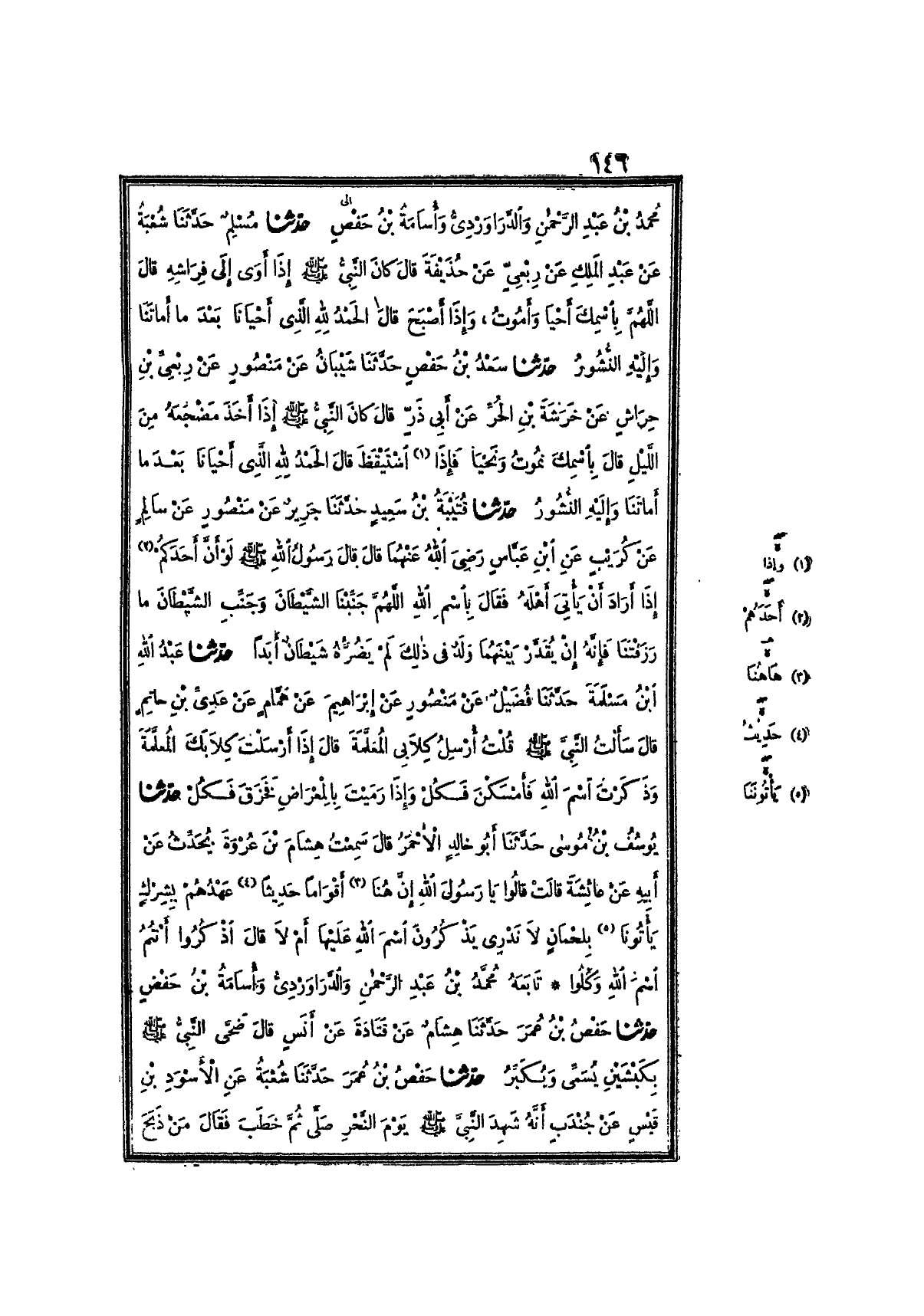7394- حَدَّثَنَا مُسْلِمٌ ، حَدَّثَنَا شُعْبَةُ ، عَنْ عَبْدِ المَلِكِ ، عَنْ رِبْعِيٍّ ، عَنْ حُذَيْفَةَ ، قَالَ : كَانَ النَّبِيُّ صَلَّى اللَّهُ عَلَيْهِ وَسَلَّمَ إِذَا أَوَى إِلَى فِرَاشِهِ , قَالَ : اللَّهُمَّ بِاسْمِكَ أَحْيَا وَأَمُوتُ ، وَإِذَا أَصْبَحَ , قَالَ : الحَمْدُ لِلَّهِ الَّذِي أَحْيَانَا بَعْدَ مَا أَمَاتَنَا ، وَإِلَيْهِ النُّشُورُ.