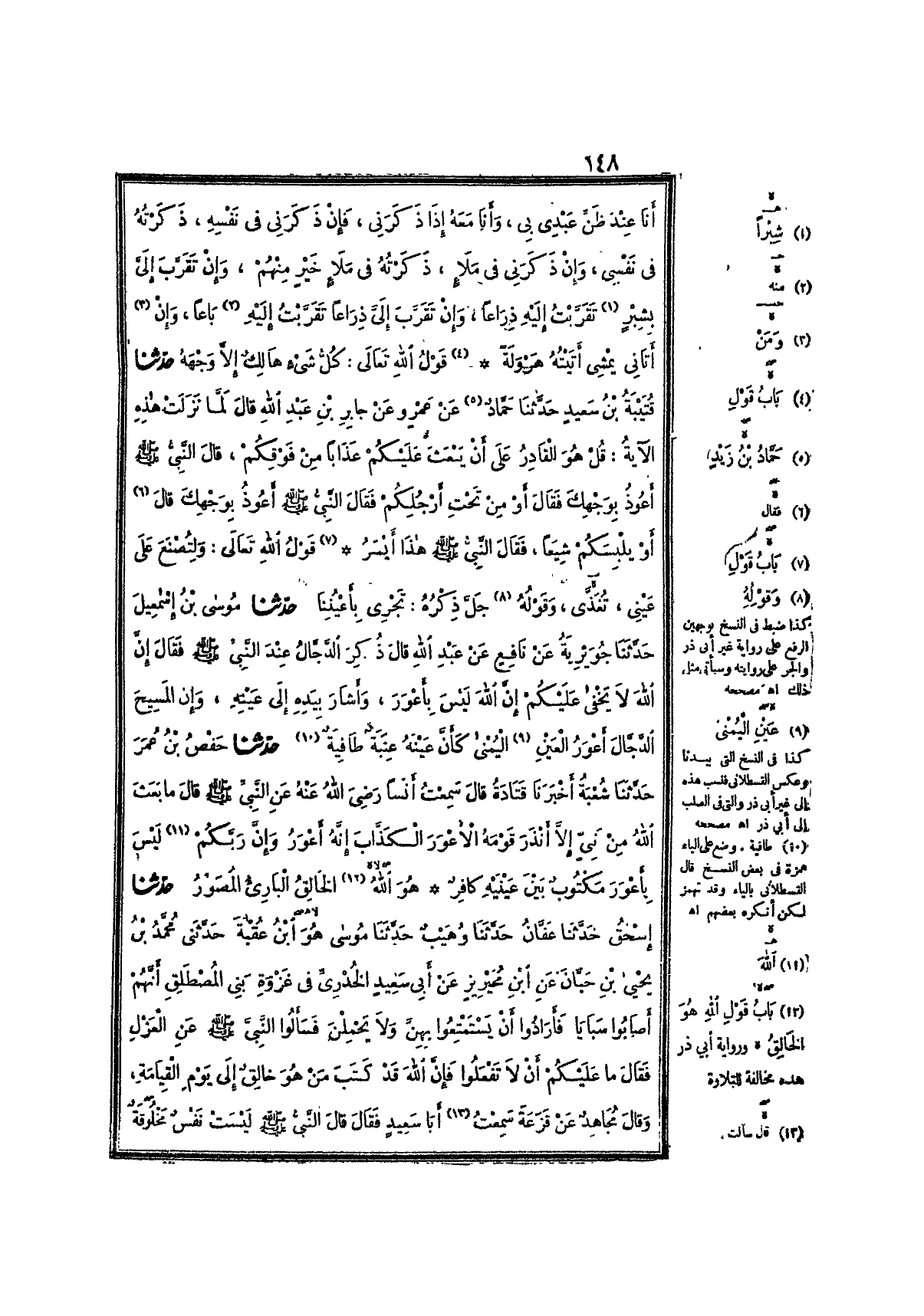 7406- حَدَّثَنَا قُتَيْبَةُ بْنُ سَعِيدٍ ، حَدَّثَنَا حَمَّادُ بْنُ زَيْدٍ ، عَنْ عَمْرٍو ، عَنْ جَابِرِ بْنِ عَبْدِ اللهِ ، قَالَ : لَمَّا نَزَلَتْ هَذِهِ الآيَةُ : {قُلْ هُوَ القَادِرُ عَلَى أَنْ يَبْعَثَ عَلَيْكُمْ عَذَابًا مِنْ فَوْقِكُمْ} َالَ النَّبِيُّ صَلَّى اللَّهُ عَلَيْهِ وَسَلَّمَ : أَعُوذُ بِوَجْهِكَ ، فَقَالَ : {أَوْ مِنْ تَحْتِ أَرْجُلِكُمْ} فَقَالَ النَّبِيُّ صَلَّى اللَّهُ عَلَيْهِ وَسَلَّمَ : أَعُوذُ بِوَجْهِكَ ، قَالَ : {أَوْ يُلْبِسَكُمْ شِيَعًا} فَقَالَ النَّبِيُّ صَلَّى اللَّهُ عَلَيْهِ وَسَلَّمَ : هَذَا أَيْسَرُ.