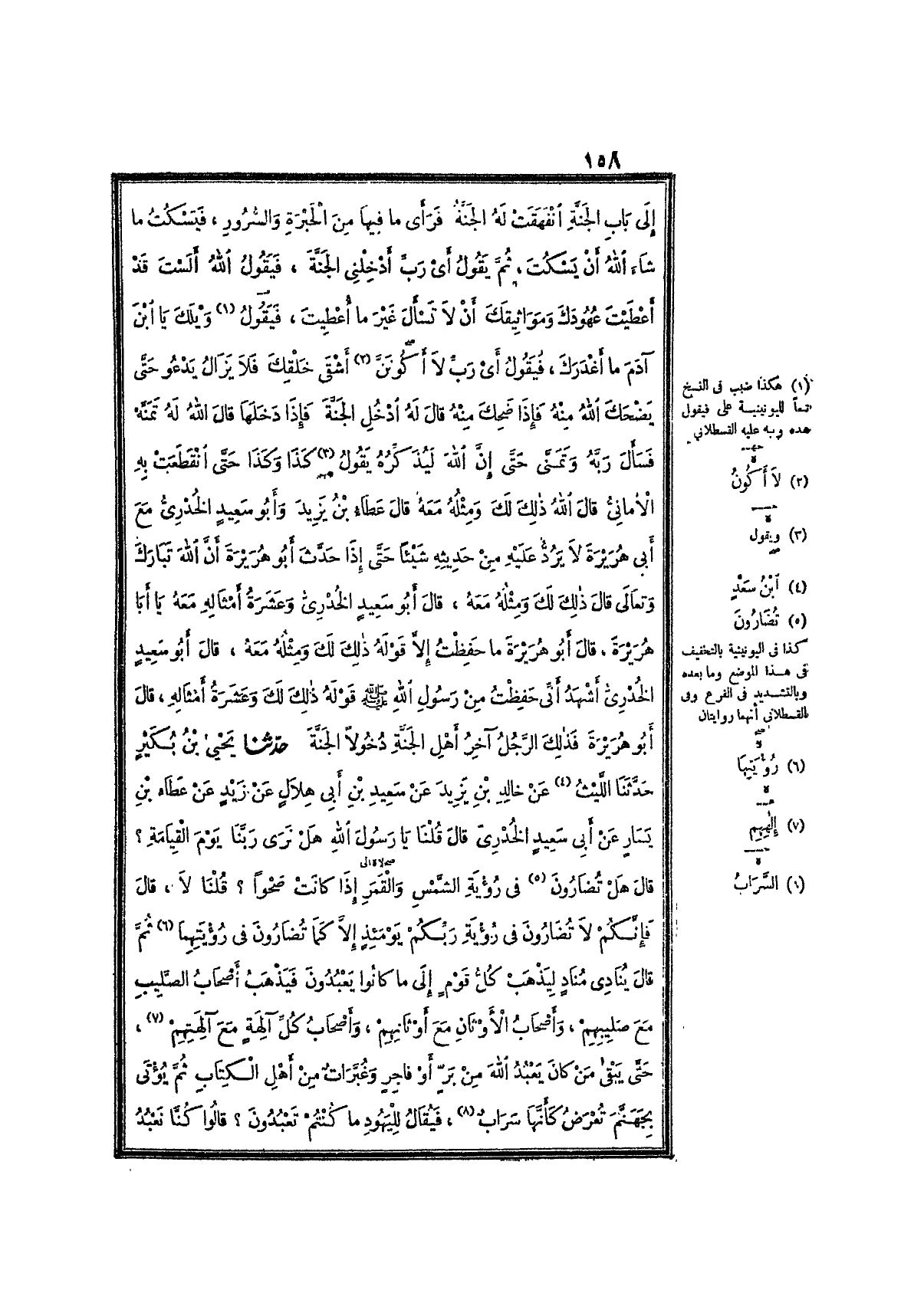 7439- حَدَّثَنَا يَحْيَى بْنُ بُكَيْرٍ ، حَدَّثَنَا اللَّيْثُ ، عَنْ خَالِدِ بْنِ يَزِيدَ ، عَنْ سَعِيدِ بْنِ أَبِي هِلاَلٍ ، عَنْ زَيْدٍ ، عَنْ عَطَاءِ بْنِ يَسَارٍ ، عَنْ أَبِي سَعِيدٍ الخُدْرِيِّ ، قَالَ : قُلْنَا : يَا رَسُولَ اللهِ , هَلْ نَرَى رَبَّنَا يَوْمَ القِيَامَةِ ؟ قَالَ : هَلْ تُضَارُونَ فِي رُؤْيَةِ الشَّمْسِ وَالقَمَرِ إِذَا كَانَتْ صَحْوًا ؟ قُلْنَا : لاَ ، قَالَ : فَإِنَّكُمْ لاَ تُضَارُونَ فِي رُؤْيَةِ رَبِّكُمْ يَوْمَئِذٍ ، إِلاَّ كَمَا تُضَارُونَ فِي رُؤْيَتِهِمَا , ثُمَّ قَالَ : يُنَادِي مُنَادٍ : لِيَذْهَبْ كُلُّ قَوْمٍ إِلَى مَا كَانُوا يَعْبُدُونَ ، فَيَذْهَبُ أَصْحَابُ الصَّلِيبِ مَعَ صَلِيبِهِمْ ، وَأَصْحَابُ الأَوْثَانِ مَعَ أَوْثَانِهِمْ ، وَأَصْحَابُ كُلِّ آلِهَةٍ مَعَ آلِهَتِهِمْ ، حَتَّى يَبْقَى مَنْ كَانَ يَعْبُدُ اللَّهَ ، مِنْ بَرٍّ أَوْ فَاجِرٍ ، وَغُبَّرَاتٌ مِنْ أَهْلِ الكِتَابِ ، ثُمَّ يُؤْتَى بِجَهَنَّمَ تُعْرَضُ كَأَنَّهَا سَرَابٌ ، فَيُقَالُ لِلْيَهُودِ : مَا كُنْتُمْ تَعْبُدُونَ ؟ قَالُوا : كُنَّا نَعْبُدُ عُزَيْرًا ابْنَ اللهِ ، فَيُقَالُ : كَذَبْتُمْ ، لَمْ يَكُنْ لِلَّهِ صَاحِبَةٌ ، وَلاَ وَلَدٌ ، فَمَا تُرِيدُونَ ؟ قَالُوا : نُرِيدُ أَنْ تَسْقِيَنَا ، فَيُقَالُ : اشْرَبُوا ، فَيَتَسَاقَطُونَ فِي جَهَنَّمَ ، ثُمَّ يُقَالُ لِلنَّصَارَى : مَا كُنْتُمْ تَعْبُدُونَ ؟ فَيَقُولُونَ : كُنَّا نَعْبُدُ المَسِيحَ ابْنَ اللهِ ، فَيُقَالُ : كَذَبْتُمْ ، لَمْ يَكُنْ لِلَّهِ صَاحِبَةٌ ، وَلاَ وَلَدٌ ، فَمَا تُرِيدُونَ ؟ فَيَقُولُونَ : نُرِيدُ أَنْ تَسْقِيَنَا ، فَيُقَالُ : اشْرَبُوا , فَيَتَسَاقَطُونَ ،
