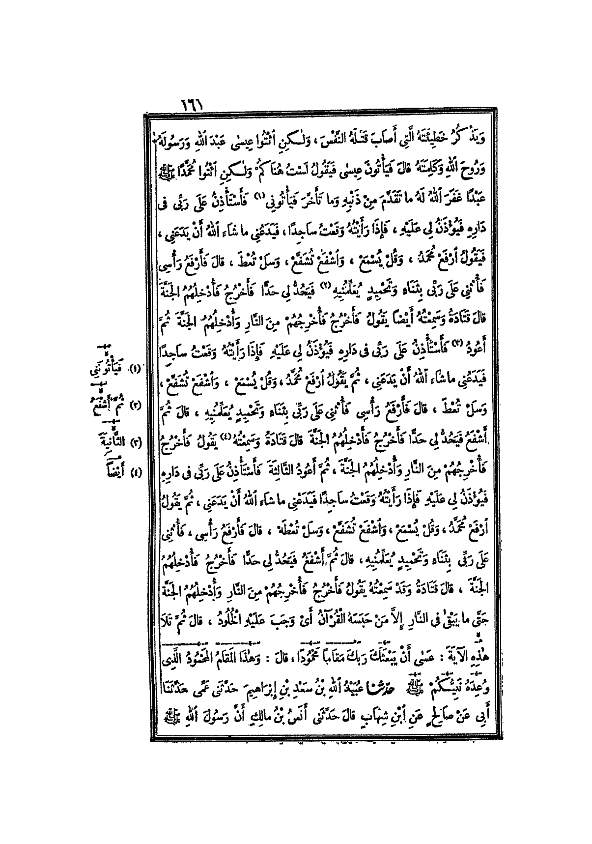 فَيَقُولُ : ارْفَعْ مُحَمَّدُ ، وَقُلْ يُسْمَعْ ، وَاشْفَعْ تُشَفَّعْ ، وَسَلْ تُعْطَ ، قَالَ : فَأَرْفَعُ رَأْسِي ، فَأُثْنِي عَلَى رَبِّي بِثَنَاءٍ وَتَحْمِيدٍ يُعَلِّمُنِيهِ ، فَيَحُدُّ لِي حَدًّا ، فَأَخْرُجُ , فَأُدْخِلُهُمُ الجَنَّةَ ، قَالَ قَتَادَةُ : وَسَمِعْتُهُ أَيْضًا يَقُولُ : فَأَخْرُجُ , فَأُخْرِجُهُمْ مِنَ النَّارِ ، وَأُدْخِلُهُمُ الجَنَّةَ ، ثُمَّ أَعُودُ : فَأَسْتَأْذِنُ عَلَى رَبِّي فِي دَارِهِ ، فَيُؤْذَنُ لِي عَلَيْهِ ، فَإِذَا رَأَيْتُهُ وَقَعْتُ سَاجِدًا ، فَيَدَعُنِي مَا شَاءَ اللَّهُ أَنْ يَدَعَنِي ، ثُمَّ يَقُولُ : ارْفَعْ مُحَمَّدُ ، وَقُلْ يُسْمَعْ ، وَاشْفَعْ تُشَفَّعْ ، وَسَلْ تُعْطَهْ ، قَالَ : فَأَرْفَعُ رَأْسِي ، فَأُثْنِي عَلَى رَبِّي بِثَنَاءٍ وَتَحْمِيدٍ يُعَلِّمُنِيهِ ، قَالَ : ثُمَّ أَشْفَعُ , فَيَحُدُّ لِي حَدًّا ، فَأَخْرُجُ ، فَأُدْخِلُهُمُ الجَنَّةَ ، قَالَ قَتَادَةُ : وَسَمِعْتُهُ يَقُولُ : فَأَخْرُجُ , فَأُخْرِجُهُمْ مِنَ النَّارِ وَأُدْخِلُهُمُ الجَنَّةَ ، ثُمَّ أَعُودُ الثَّالِثَةَ : فَأَسْتَأْذِنُ عَلَى رَبِّي فِي دَارِهِ ، فَيُؤْذَنُ لِي عَلَيْهِ ، فَإِذَا رَأَيْتُهُ وَقَعْتُ سَاجِدًا ، فَيَدَعُنِي مَا شَاءَ اللَّهُ أَنْ يَدَعَنِي ، ثُمَّ يَقُولُ : ارْفَعْ مُحَمَّدُ ، وَقُلْ يُسْمَعْ ، وَاشْفَعْ تُشَفَّعْ ، وَسَلْ تُعْطَهْ ، قَالَ : فَأَرْفَعُ رَأْسِي ، فَأُثْنِي عَلَى رَبِّي بِثَنَاءٍ وَتَحْمِيدٍ يُعَلِّمُنِيهِ ، قَالَ : ثُمَّ أَشْفَعُ , فَيَحُدُّ لِي حَدًّا ، فَأَخْرُجُ , فَأُدْخِلُهُمُ الجَنَّةَ ، قَالَ قَتَادَةُ : وَقَدْ سَمِعْتُهُ يَقُولُ : فَأَخْرُجُ , فَأُخْرِجُهُمْ مِنَ النَّارِ ، وَأُدْخِلُهُمُ الجَنَّةَ ، حَتَّى مَا يَبْقَى فِي النَّارِ إِلاَّ مَنْ حَبَسَهُ القُرْآنُ ، أَيْ : وَجَبَ عَلَيْهِ الخُلُودُ ، ثُمَّ تَلاَ الآيَةَ : {عَسَى أَنْ يَبْعَثَكَ رَبُّكَ مَقَامًا مَحْمُودًا} قَالَ : وَهَذَا المَقَامُ الَّذِي وُعِدَهُ نَبِيُّكُمْ صَلَّى اللَّهُ عَلَيْهِ وَسَلَّمَ.