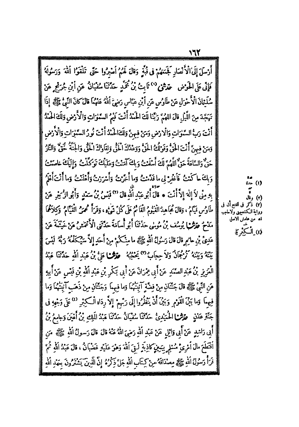 7442- حَدَّثَنِي ثَابِتُ بْنُ مُحَمَّدٍ ، حَدَّثَنَا سُفْيَانُ ، عَنِ ابْنِ جُرَيْجٍ ، عَنْ سُلَيْمَانَ الأَحْوَلِ ، عَنْ طَاوُوسٍ ، عَنِ ابْنِ عَبَّاسٍ ، رَضِيَ اللَّهُ عَنْهُمَا ، قَالَ : كَانَ النَّبِيُّ صَلَّى اللَّهُ عَلَيْهِ وَسَلَّمَ إِذَا تَهَجَّدَ مِنَ اللَّيْلِ , قَالَ : اللَّهُمَّ رَبَّنَا لَكَ الحَمْدُ , أَنْتَ قَيِّمُ السَّمَاوَاتِ وَالأَرْضِ ، وَلَكَ الحَمْدُ , أَنْتَ رَبُّ السَّمَاوَاتِ وَالأَرْضِ وَمَنْ فِيهِنَّ ، وَلَكَ الحَمْدُ , أَنْتَ نُورُ السَّمَاوَاتِ وَالأَرْضِ وَمَنْ فِيهِنَّ ، أَنْتَ الحَقُّ ، وَقَوْلُكَ الحَقُّ ، وَوَعْدُكَ الحَقُّ ، وَلِقَاؤُكَ الحَقُّ ، وَالجَنَّةُ حَقٌّ ، وَالنَّارُ حَقٌّ ، وَالسَّاعَةُ حَقٌّ ، اللَّهُمَّ لَكَ أَسْلَمْتُ ، وَبِكَ آمَنْتُ ، وَعَلَيْكَ تَوَكَّلْتُ ، وَإِلَيْكَ خَاصَمْتُ ، وَبِكَ حَاكَمْتُ ، فَاغْفِرْ لِي مَا قَدَّمْتُ وَمَا أَخَّرْتُ ، وَأَسْرَرْتُ وَأَعْلَنْتُ ، وَمَا أَنْتَ أَعْلَمُ بِهِ مِنِّي ، لاَ إِلَهَ إِلاَّ أَنْتَ.