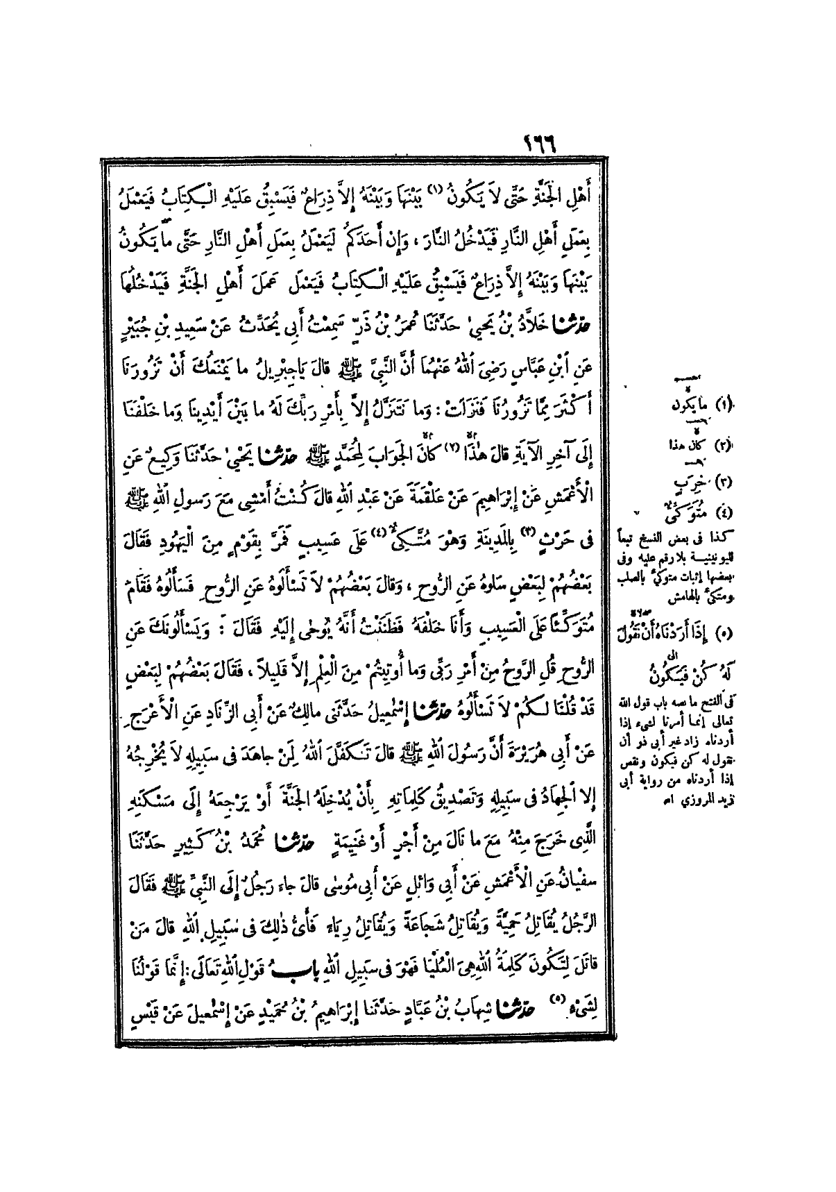7456- حَدَّثَنَا يَحْيَى ، حَدَّثَنَا وَكِيعٌ ، عَنِ الأَعْمَشِ ، عَنْ إِبْرَاهِيمَ ، عَنْ عَلْقَمَةَ ، عَنْ عَبْدِ اللهِ ، قَالَ : كُنْتُ أَمْشِي مَعَ رَسُولِ اللهِ صَلَّى اللَّهُ عَلَيْهِ وَسَلَّمَ فِي حَرْثٍ بِالْمَدِينَةِ , وَهُوَ مُتَّكِئٌ عَلَى عَسِيبٍ ، فَمَرَّ بِقَوْمٍ مِنَ اليَهُودِ ، فَقَالَ بَعْضُهُمْ لِبَعْضٍ : سَلُوهُ عَنِ الرُّوحِ ، وَقَالَ بَعْضُهُمْ : لاَ تَسْأَلُوهُ ، فَسَأَلُوهُ عَنِ الرُّوحِ ، فَقَامَ مُتَوَكِّئًا عَلَى العَسِيبِ وَأَنَا خَلْفَهُ , فَظَنَنْتُ أَنَّهُ يُوحَى إِلَيْهِ ، فَقَالَ : {وَيَسْأَلُونَكَ عَنِ الرُّوحِ قُلِ الرُّوحُ مِنْ أَمْرِ رَبِّي وَمَا أُوتِيتُمْ مِنَ العِلْمِ إِلاَّ قَلِيلاً} فَقَالَ بَعْضُهُمْ لِبَعْضٍ : قَدْ قُلْنَا لَكُمْ : لاَ تَسْأَلُوهُ.