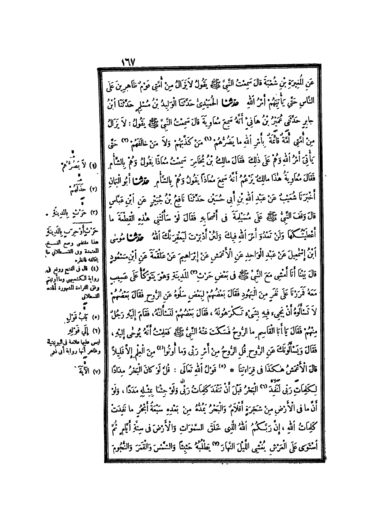 7460- حَدَّثَنَا الحُمَيْدِيُّ ، حَدَّثَنَا الوَلِيدُ بْنُ مُسْلِمٍ ، حَدَّثَنَا ابْنُ جَابِرٍ ، حَدَّثَنِي عُمَيْرُ بْنُ هَانِئٍ ، أَنَّهُ سَمِعَ مُعَاوِيَةَ ، قَالَ : سَمِعْتُ النَّبِيَّ صَلَّى اللَّهُ عَلَيْهِ وَسَلَّمَ يَقُولُ : لاَ يَزَالُ مِنْ أُمَّتِي أُمَّةٌ قَائِمَةٌ بِأَمْرِ اللهِ ، لاَ يَضُرُّهُمْ مَنْ كَذَّبَهُمْ ، وَلاَ مَنْ خَذلَهُمْ ، حَتَّى يَأْتِيَ أَمْرُ اللهِ وَهُمْ عَلَى ذَلِكَ ، فَقَالَ مَالِكُ بْنُ يُخَامِرَ : سَمِعْتُ مُعَاذًا يَقُولُ وَهُمْ بِالشَّامِ ، فَقَالَ مُعَاوِيَةُ : هَذَا مَالِكٌ يَزْعُمُ أَنَّهُ سَمِعَ مُعَاذًا يَقُولُ : وَهُمْ بِالشَّامِ.