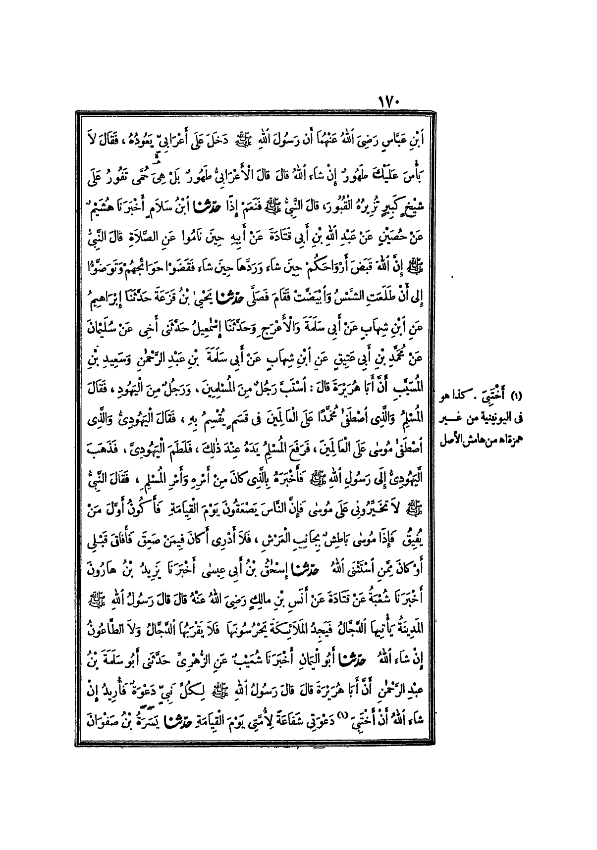 7472- حَدَّثَنَا يَحْيَى بْنُ قَزَعَةَ ، حَدَّثَنَا إِبْرَاهِيمُ ، عَنِ ابْنِ شِهَابٍ ، عَنْ أَبِي سَلَمَةَ ، وَالأَعْرَجِ (ح) وَحَدَّثَنَا إِسْمَاعِيلُ ، حَدَّثَنِي أَخِي ، عَنْ سُلَيْمَانَ ، عَنْ مُحَمَّدِ بْنِ أَبِي عَتِيقٍ ، عَنِ ابْنِ شِهَابٍ ، عَنْ أَبِي سَلَمَةَ بْنِ عَبْدِ الرَّحْمَنِ ، وَسَعِيدِ بْنِ الْمُسَيَّبِ ، أَنَّ أَبَا هُرَيْرَةَ قَالَ : اسْتَبَّ رَجُلٌ مِنَ المُسْلِمِينَ وَرَجُلٌ مِنَ اليَهُودِ ، فَقَالَ المُسْلِمُ : وَالَّذِي اصْطَفَى مُحَمَّدًا عَلَى العَالَمِينَ , فِي قَسَمٍ يُقْسِمُ بِهِ ، فَقَالَ اليَهُودِيُّ : وَالَّذِي اصْطَفَى مُوسَى عَلَى العَالَمِينَ ، فَرَفَعَ المُسْلِمُ يَدَهُ عِنْدَ ذَلِكَ فَلَطَمَ اليَهُودِيَّ ، فَذَهَبَ اليَهُودِيُّ إِلَى رَسُولِ اللهِ صَلَّى اللَّهُ عَلَيْهِ وَسَلَّمَ ، فَأَخْبَرَهُ بِالَّذِي كَانَ مِنْ أَمْرِهِ ، وَأَمْرِ المُسْلِمِ , فَقَالَ النَّبِيُّ صَلَّى اللَّهُ عَلَيْهِ وَسَلَّمَ : لاَ تُخَيِّرُونِي عَلَى مُوسَى ، فَإِنَّ النَّاسَ يَصْعَقُونَ يَوْمَ القِيَامَةِ ، فَأَكُونُ أَوَّلَ مَنْ يُفِيقُ ، فَإِذَا مُوسَى بَاطِشٌ بِجَانِبِ العَرْشِ ، فَلاَ أَدْرِي أَكَانَ فِيمَنْ صَعِقَ فَأَفَاقَ قَبْلِي ، أَوْ كَانَ مِمَّنِ اسْتَثْنَى اللَّهُ.