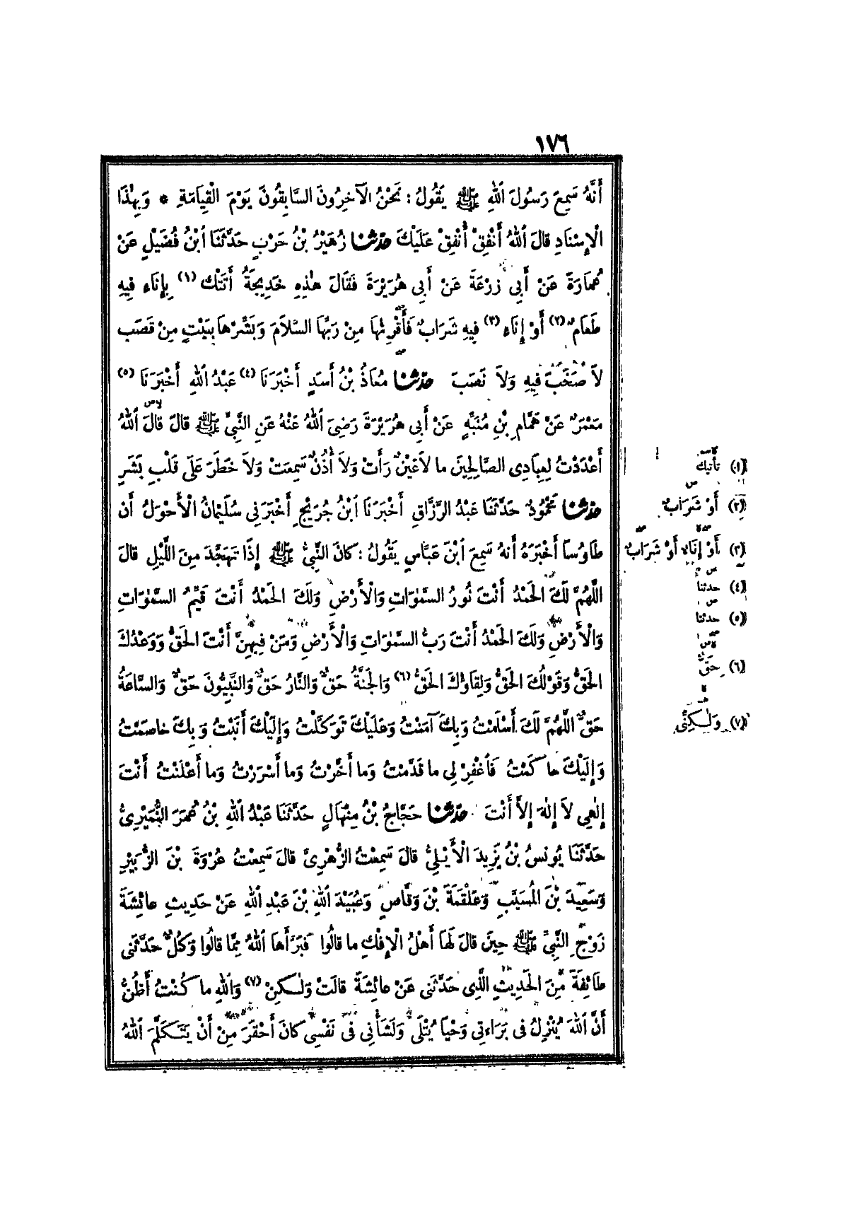 7499- حَدَّثَنَا مَحْمُودٌ ، حَدَّثَنَا عَبْدُ الرَّزَّاقِ ، أَخْبَرَنَا ابْنُ جُرَيْجٍ ، أَخْبَرَنِي سُلَيْمَانُ الأَحْوَلُ ، أَنَّ طَاوُوسًا أَخْبَرَهُ , أَنَّهُ سَمِعَ ابْنَ عَبَّاسٍ يَقُولُ : كَانَ النَّبِيُّ صَلَّى اللَّهُ عَلَيْهِ وَسَلَّمَ إِذَا تَهَجَّدَ مِنَ اللَّيْلِ , قَالَ : اللَّهُمَّ لَكَ الحَمْدُ أَنْتَ نُورُ السَّمَاوَاتِ وَالأَرْضِ ، وَلَكَ الحَمْدُ أَنْتَ قَيِّمُ السَّمَاوَاتِ وَالأَرْضِ ، وَلَكَ الحَمْدُ أَنْتَ رَبُّ السَّمَاوَاتِ وَالأَرْضِ وَمَنْ فِيهِنَّ ، أَنْتَ الحَقُّ ، وَوَعْدُكَ الحَقُّ ، وَقَوْلُكَ الحَقُّ ، وَلِقَاؤُكَ الحَقُّ ، وَالجَنَّةُ حَقٌّ ، وَالنَّارُ حَقٌّ ، وَالنَّبِيُّونَ حَقٌّ ، وَالسَّاعَةُ حَقٌّ ، اللَّهُمَّ لَكَ أَسْلَمْتُ ، وَبِكَ آمَنْتُ ، وَعَلَيْكَ تَوَكَّلْتُ ، وَإِلَيْكَ أَنَبْتُ ، وَبِكَ خَاصَمْتُ ، وَإِلَيْكَ حَاكَمْتُ ، فَاغْفِرْ لِي مَا قَدَّمْتُ وَمَا أَخَّرْتُ ، وَمَا أَسْرَرْتُ وَمَا أَعْلَنْتُ ، أَنْتَ إِلَهِي لاَ إِلَهَ إِلاَّ أَنْتَ.