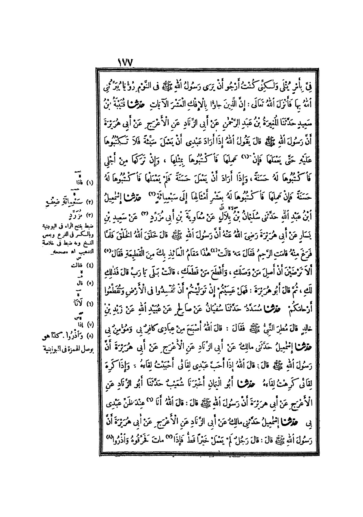 7501- حَدَّثَنَا قُتَيْبَةُ بْنُ سَعِيدٍ ، حَدَّثَنَا المُغِيرَةُ بْنُ عَبْدِ الرَّحْمَنِ ، عَنْ أَبِي الزِّنَادِ ، عَنِ الأَعْرَجِ ، عَنْ أَبِي هُرَيْرَةَ ؛ أَنَّ رَسُولَ اللهِ صَلَّى اللَّهُ عَلَيْهِ وَسَلَّمَ قَالَ : يَقُولُ اللَّهُ : إِذَا أَرَادَ عَبْدِي أَنْ يَعْمَلَ سَيِّئَةً ، فَلاَ تَكْتُبُوهَا عَلَيْهِ حَتَّى يَعْمَلَهَا ، فَإِنْ عَمِلَهَا فَاكْتُبُوهَا بِمِثْلِهَا ، وَإِنْ تَرَكَهَا مِنْ أَجْلِي فَاكْتُبُوهَا لَهُ حَسَنَةً ، وَإِذَا أَرَادَ أَنْ يَعْمَلَ حَسَنَةً فَلَمْ يَعْمَلْهَا فَاكْتُبُوهَا لَهُ حَسَنَةً ، فَإِنْ عَمِلَهَا فَاكْتُبُوهَا لَهُ بِعَشْرِ أَمْثَالِهَا إِلَى سَبْعِ مِئَةِ.