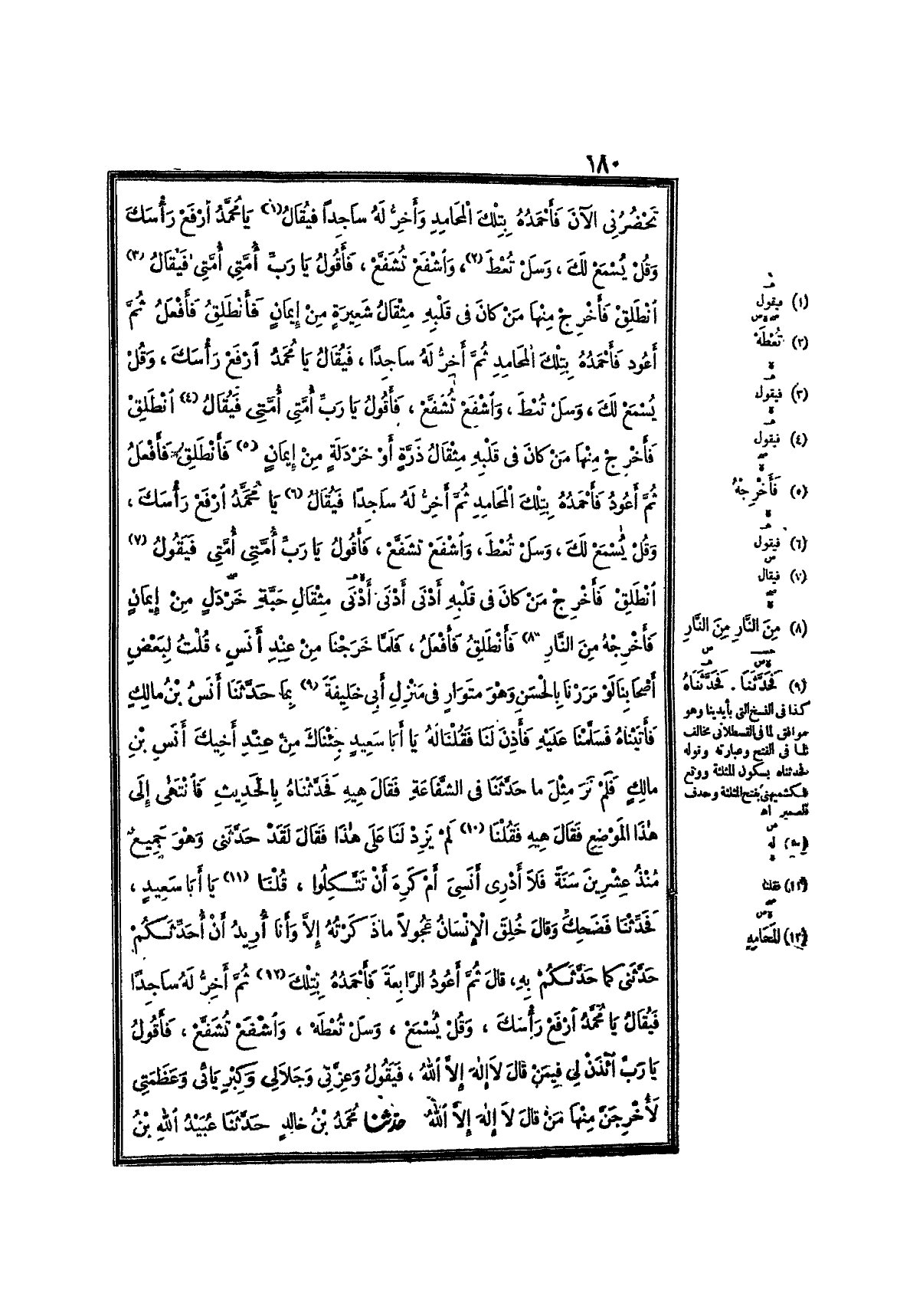 فَأَنْطَلِقُ فَأَفْعَلُ ، ثُمَّ أَعُودُ ، فَأَحْمَدُهُ بِتِلْكَ المَحَامِدِ ، ثُمَّ أَخِرُّ لَهُ سَاجِدًا ، فَيُقَالُ : يَا مُحَمَّدُ , ارْفَعْ رَأْسَكَ ، وَقُلْ يُسْمَعْ لَكَ ، وَسَلْ تُعْطَ ، وَاشْفَعْ تُشَفَّعْ ، فَأَقُولُ : يَا رَبِّ ، أُمَّتِي ، فَيُقَالُ : انْطَلِقْ , فَأَخْرِجْ مِنْهَا مَنْ كَانَ فِي قَلْبِهِ مِثْقَالُ ذَرَّةٍ ، أَوْ خَرْدَلَةٍ ، مِنْ إِيمَانٍ ، فَأَنْطَلِقُ فَأَفْعَلُ ، ثُمَّ أَعُودُ فَأَحْمَدُهُ بِتِلْكَ المَحَامِدِ ، ثُمَّ أَخِرُّ لَهُ سَاجِدًا ، فَيُقَالُ : يَا مُحَمَّدُ , ارْفَعْ رَأْسَكَ ، وَقُلْ يُسْمَعْ لَكَ ، وَسَلْ تُعْطَ ، وَاشْفَعْ تُشَفَّعْ ، فَأَقُولُ : يَا رَبِّ أُمَّتِي أُمَّتِي ، فَيَقُولُ : انْطَلِقْ , فَأَخْرِجْ مَنْ كَانَ فِي قَلْبِهِ أَدْنَى أَدْنَى مِثْقَالِ حَبَّةِ خَرْدَلٍ مِنْ إِيمَانٍ ، فَأَخْرِجْهُ مِنَ النَّارِ ، فَأَنْطَلِقُ , فَأَفْعَلُ , فَلَمَّا خَرَجْنَا مِنْ عِنْدِ أَنَسٍ , قُلْتُ لِبَعْضِ أَصْحَابِنَا : لَوْ مَرَرْنَا بِالحَسَنِ وَهُوَ مُتَوَارٍ فِي مَنْزِلِ أَبِي خَلِيفَةَ , فَحَدَّثَنَا بِمَا حَدَّثَنَا أَنَسُ بْنُ مَالِكٍ ، فَأَتَيْنَاهُ فَسَلَّمْنَا عَلَيْهِ ، فَأَذِنَ لَنَا , فَقُلْنَا لَهُ : يَا أَبَا سَعِيدٍ ، جِئْنَاكَ مِنْ عِنْدِ أَخِيكَ أَنَسِ بْنِ مَالِكٍ ، فَلَمْ نَرَ مِثْلَ مَا حَدَّثَنَا فِي الشَّفَاعَةِ ، فَقَالَ : هِيهْ , فَحَدَّثْنَاهُ بِالحَدِيثِ ، فَانْتَهَى إِلَى هَذَا المَوْضِعِ ، فَقَالَ : هِيهْ ، فَقُلْنَا : لَمْ يَزِدْ لَنَا عَلَى هَذَا ، فَقَالَ : لَقَدْ حَدَّثَنِي وَهُوَ جَمِيعٌ مُنْذُ عِشْرِينَ سَنَةً , فَلاَ أَدْرِي أَنَسِيَ أَمْ كَرِهَ أَنْ تَتَّكِلُوا ، قُلْنَا : يَا أَبَا سَعِيدٍ , فَحَدِّثْنَا , فَضَحِكَ ، وَقَالَ : خُلِقَ الإِنْسَانُ عَجُولاً , مَا ذَكَرْتُهُ إِلاَّ وَأَنَا أُرِيدُ أَنْ أُحَدِّثَكُمْ , حَدَّثَنِي كَمَا حَدَّثَكُمْ بِهِ ، قَالَ : ثُمَّ أَعُودُ الرَّابِعَةَ , فَأَحْمَدُهُ بِتِلْكَ ، ثُمَّ أَخِرُّ لَهُ سَاجِدًا ، فَيُقَالُ : يَا مُحَمَّدُ , ارْفَعْ رَأْسَكَ ، وَقُلْ يُسْمَعْ ، وَسَلْ تُعْطَهْ ، وَاشْفَعْ تُشَفَّعْ ، فَأَقُولُ : يَا رَبِّ , ائْذَنْ لِي فِيمَنْ قَالَ : لاَ إِلَهَ إِلاَّ اللَّهُ ، فَيَقُولُ : وَعِزَّتِي وَجَلاَلِي ، وَكِبْرِيَائِي وَعَظَمَتِي , لأُخْرِجَنَّ مِنْهَا مَنْ قَالَ لاَ إِلَهَ إِلاَّ اللَّهُ.