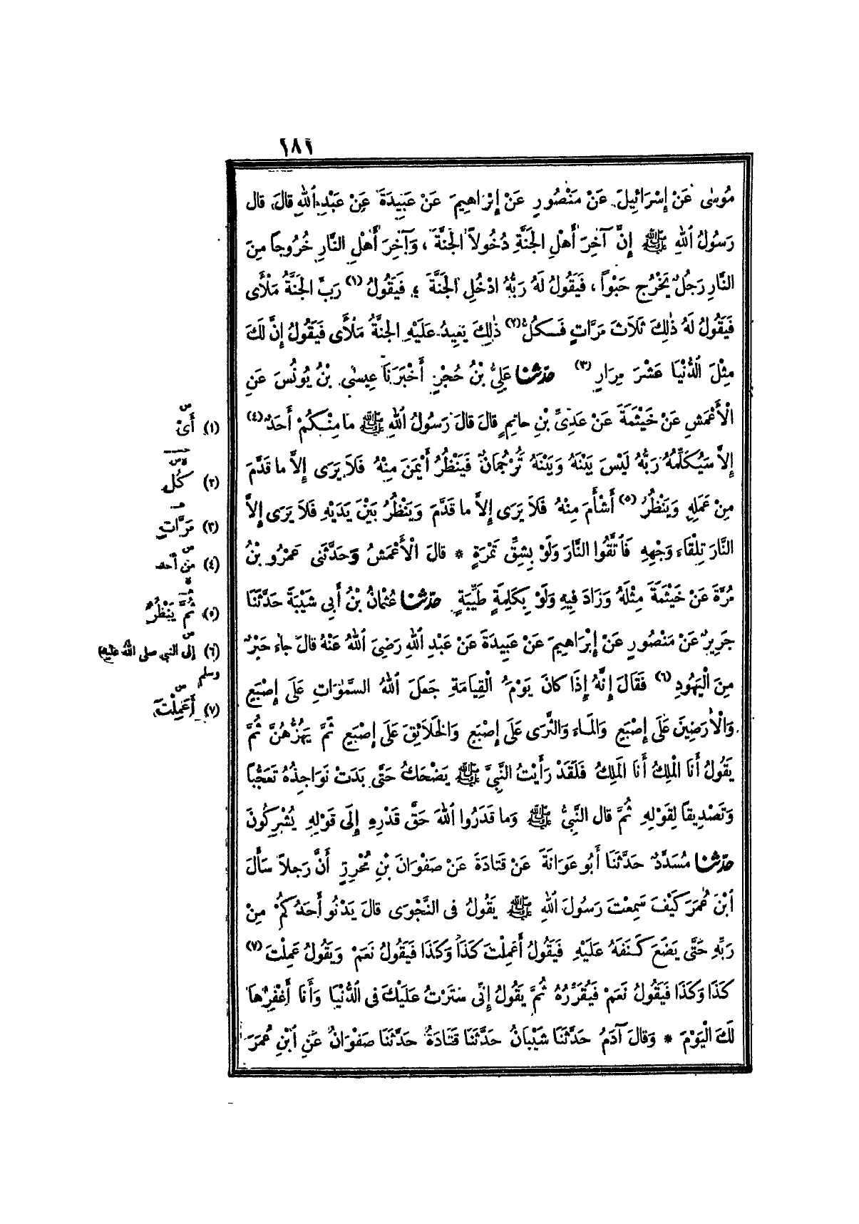 7512- حَدَّثَنَا عَلِيُّ بْنُ حُجْرٍ ، أَخْبَرَنَا عِيسَى بْنُ يُونُسَ ، عَنِ الأَعْمَشِ ، عَنْ خَيْثَمَةَ ، عَنْ عَدِيِّ بْنِ حَاتِمٍ ، قَالَ : قَالَ رَسُولُ اللهِ صَلَّى اللَّهُ عَلَيْهِ وَسَلَّمَ : مَا مِنْكُمْ مِنْ أَحَدٌ إِلاَّ سَيُكَلِّمُهُ رَبُّهُ , لَيْسَ بَيْنَهُ وَبَيْنَهُ تُرْجُمَانٌ ، فَيَنْظُرُ أَيْمَنَ مِنْهُ فَلاَ يَرَى إِلاَّ مَا قَدَّمَ مِنْ عَمَلِهِ ، وَيَنْظُرُ أَشْأَمَ مِنْهُ فَلاَ يَرَى إِلاَّ مَا قَدَّمَ ، وَيَنْظُرُ بَيْنَ يَدَيْهِ فَلاَ يَرَى إِلاَّ النَّارَ تِلْقَاءَ وَجْهِهِ ، فَاتَّقُوا النَّارَ وَلَوْ بِشِقِّ تَمْرَةٍ.