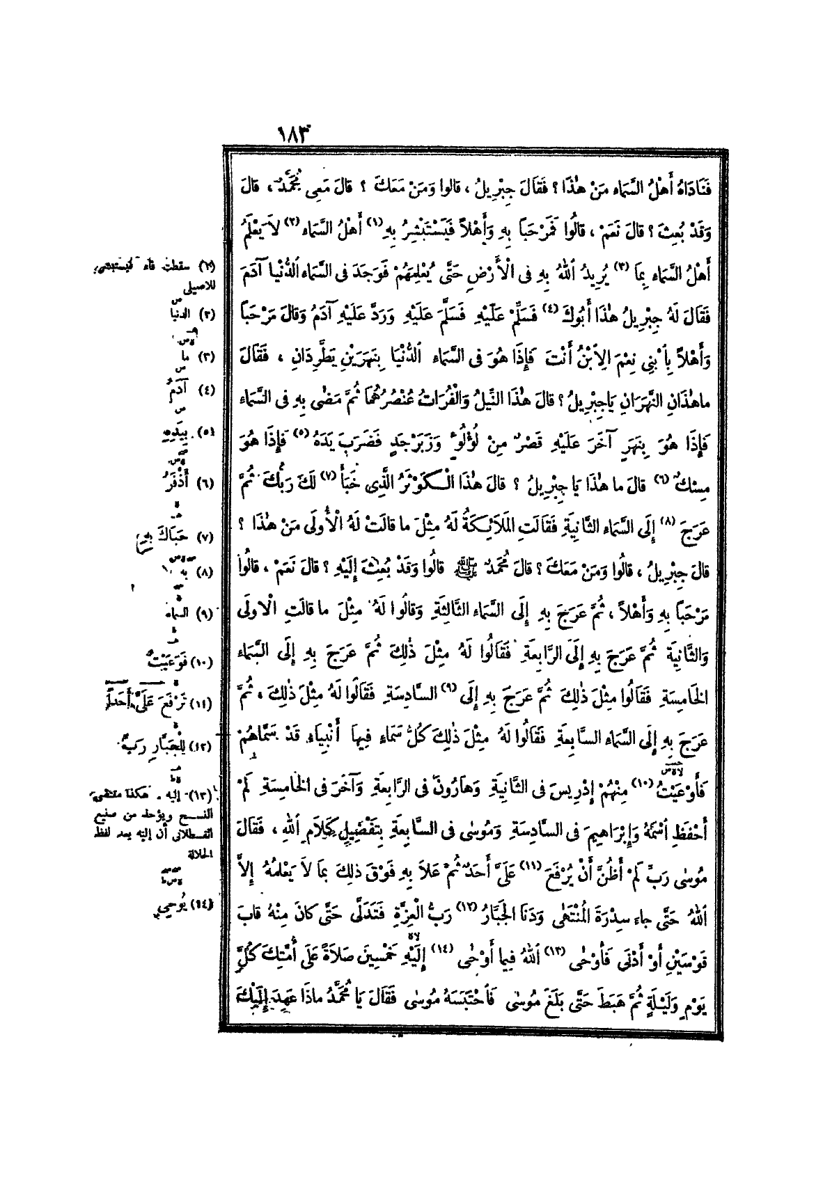 فَقَالَ : مَا هَذَانِ النَّهَرَانِ يَا جِبْرِيلُ ؟ قَالَ : هَذَا النِّيلُ وَالفُرَاتُ عُنْصُرُهُمَا ، ثُمَّ مَضَى بِهِ فِي السَّمَاءِ ، فَإِذَا بِنَهَرٍ آخَرَ عَلَيْهِ قَصْرٌ مِنْ لُؤْلُؤٍ وَزَبَرْجَدٍ ، فَضَرَبَ يَدَهُ فَإِذَا هُوَ مِسْكٌ أَذْفَرُ ، قَالَ : مَا هَذَا يَا جِبْرِيلُ ؟ قَالَ : هَذَا الكَوْثَرُ الَّذِي خَبَأَ لَكَ رَبُّكَ ، ثُمَّ عَرَجَ إِلَى السَّمَاءِ الثَّانِيَةِ ، فَقَالَتِ المَلاَئِكَةُ لَهُ مِثْلَ مَا قَالَتْ لَهُ الأُولَى : مَنْ هَذَا ؟ قَالَ : جِبْرِيلُ , قَالُوا : وَمَنْ مَعَكَ ؟ قَالَ : مُحَمَّدٌ صَلَّى اللَّهُ عَلَيْهِ وَسَلَّمَ ، قَالُوا : وَقَدْ بُعِثَ إِلَيْهِ ؟ قَالَ : نَعَمْ ، قَالُوا : مَرْحَبًا بِهِ وَأَهْلاً ، ثُمَّ عَرَجَ بِهِ إِلَى السَّمَاءِ الثَّالِثَةِ ، وَقَالُوا لَهُ مِثْلَ مَا قَالَتِ الأُولَى , وَالثَّانِيَةُ ، ثُمَّ عَرَجَ بِهِ إِلَى الرَّابِعَةِ ، فَقَالُوا لَهُ مِثْلَ ذَلِكَ ، ثُمَّ عَرَجَ بِهِ إِلَى السَّمَاءِ الخَامِسَةِ ، فَقَالُوا مِثْلَ ذَلِكَ ، ثُمَّ عَرَجَ بِهِ إِلَى السَّادِسَةِ ، فَقَالُوا لَهُ مِثْلَ ذَلِكَ ، ثُمَّ عَرَجَ بِهِ إِلَى السَّمَاءِ السَّابِعَةِ ، فَقَالُوا لَهُ مِثْلَ ذَلِكَ ، كُلُّ سَمَاءٍ فِيهَا أَنْبِيَاءُ قَدْ سَمَّاهُمْ ، فَأَوْعَيْتُ مِنْهُمْ إِدْرِيسَ فِي الثَّانِيَةِ ، وَهَارُونَ فِي الرَّابِعَةِ ، وَآخَرَ فِي الخَامِسَةِ لَمْ أَحْفَظِ اسْمَهُ ، وَإِبْرَاهِيمَ فِي السَّادِسَةِ ، وَمُوسَى فِي السَّابِعَةِ بِفَضْلِ كَلاَمِهِ للهِ ، فَقَالَ مُوسَى : رَبِّ لَمْ أَظُنَّ أَنْ تَرْفَعَ عَلَيَّ أَحَدًا ، ثُمَّ عَلاَ بِهِ فَوْقَ ذَلِكَ بِمَا لاَ يَعْلَمُهُ إِلاَّ اللَّهُ ، حَتَّى جَاءَ سِدْرَةَ المُنْتَهَى ، وَدَنَا الجَبَّارُ رَبُّ العِزَّةِ ، فَتَدَلَّى حَتَّى كَانَ مِنْهُ قَابَ قَوْسَيْنِ أَوْ أَدْنَى ، فَأَوْحَى اللَّهُ فِيمَا أَوْحَى : خَمْسِينَ صَلاَةً عَلَى أُمَّتِكَ كُلَّ يَوْمٍ وَلَيْلَةٍ ، ثُمَّ هَبَطَ حَتَّى بَلَغَ مُوسَى ، فَاحْتَبَسَهُ مُوسَى ، فَقَالَ : يَا مُحَمَّدُ ، مَاذَا عَهِدَ إِلَيْكَ رَبُّكَ ؟ قَالَ : عَهِدَ إِلَيَّ خَمْسِينَ صَلاَةً كُلَّ يَوْمٍ وَلَيْلَةٍ ،