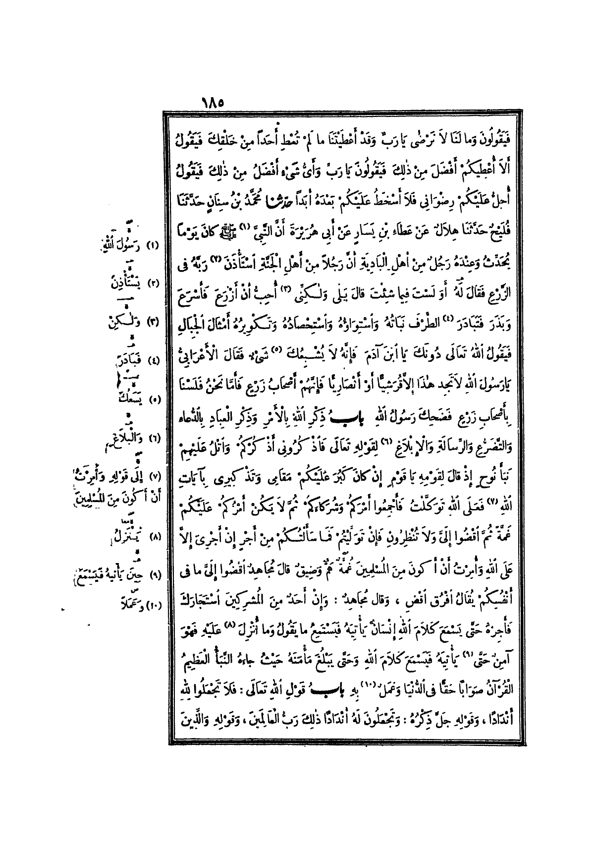7519- حَدَّثَنَا مُحَمَّدُ بْنُ سِنَانٍ ، حَدَّثَنَا فُلَيْحٌ ، حَدَّثَنَا هِلاَلٌ ، عَنْ عَطَاءِ بْنِ يَسَارٍ ، عَنْ أَبِي هُرَيْرَةَ ؛ أَنَّ النَّبِيَّ صَلَّى اللَّهُ عَلَيْهِ وَسَلَّمَ كَانَ يَوْمًا يُحَدِّثُ , وَعِنْدَهُ رَجُلٌ مِنْ أَهْلِ البَادِيَةِ ؛ أَنَّ رَجُلاً مِنْ أَهْلِ الجَنَّةِ اسْتَأْذَنَ رَبَّهُ فِي الزَّرْعِ ، فَقَالَ لَهُ : أَوَلَسْتَ فِيمَا شِئْتَ ؟ قَالَ : بَلَى ، وَلَكِنِّي أُحِبُّ أَنْ أَزْرَعَ ، فَأَسْرَعَ وَبَذَرَ ، فَتَبَادَرَ الطَّرْفَ نَبَاتُهُ وَاسْتِوَاؤُهُ وَاسْتِحْصَادُهُ وَتَكْوِيرُهُ أَمْثَالَ الجِبَالِ ، فَيَقُولُ اللَّهُ تَعَالَى : دُونَكَ يَا ابْنَ آدَمَ ، فَإِنَّهُ لاَ يُشْبِعُكَ شَيْءٌ ، فَقَالَ الأَعْرَابِيُّ : يَا رَسُولَ اللهِ ، لاَ تَجِدُ هَذَا إِلاَّ قُرَشِيًّا أَوْ أَنْصَارِيًّا ، فَإِنَّهُمْ أَصْحَابُ زَرْعٍ ، فَأَمَّا نَحْنُ فَلَسْنَا بِأَصْحَابِ زَرْعٍ ، فَضَحِكَ رَسُولُ اللهِ صَلَّى اللَّهُ عَلَيْهِ وَسَلَّمَ.