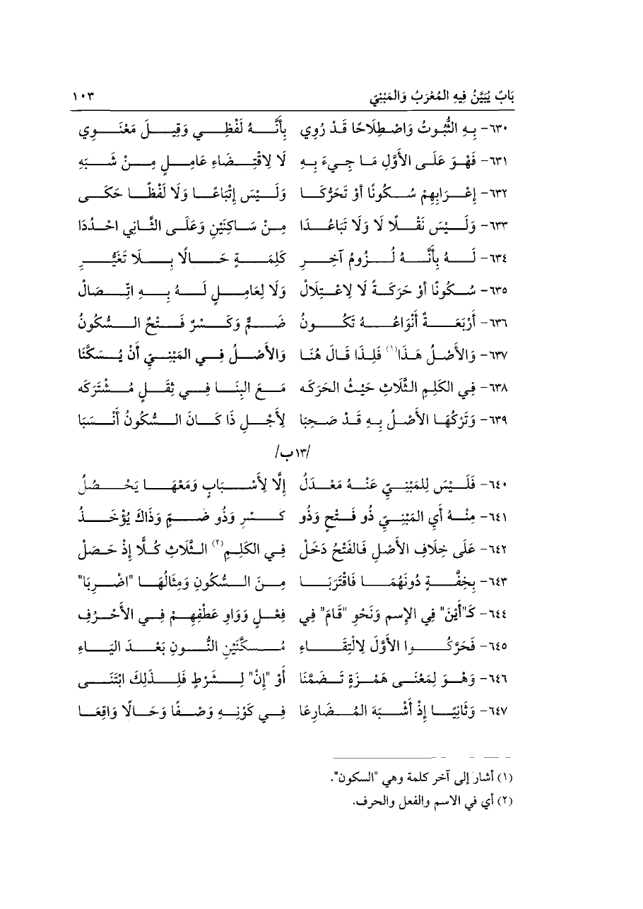 ٦٣٩ - وَتَرْكُهَا الأَصْلُ بِهِ قَدْ صَحِبَا ... لِأَجْلِ ذَا كَانَ السُّكُونُ أَنْسَبَا ... /١٣ ب/