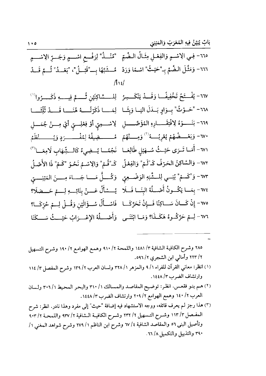 ٦٦٦ - وَمَثَّلَ الضَّمَّ بِـ"حَيْثُ" اسْمًا وَرَدْ ... مُشَبَّهًا بِـ"قَبْلُ"، "بَعْدُ" ثُمَّ قَدْ ... /١٤ أ/
