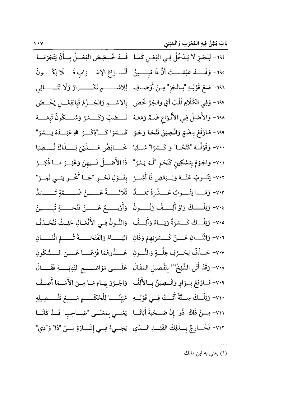 ٧٠٧ - حَذْفٌ لِحَرْفِ عِلَّةٍ وَالنُّونِ ... عَدُّوهُمَا فَرْعًا عَنِ السُّكُونِ