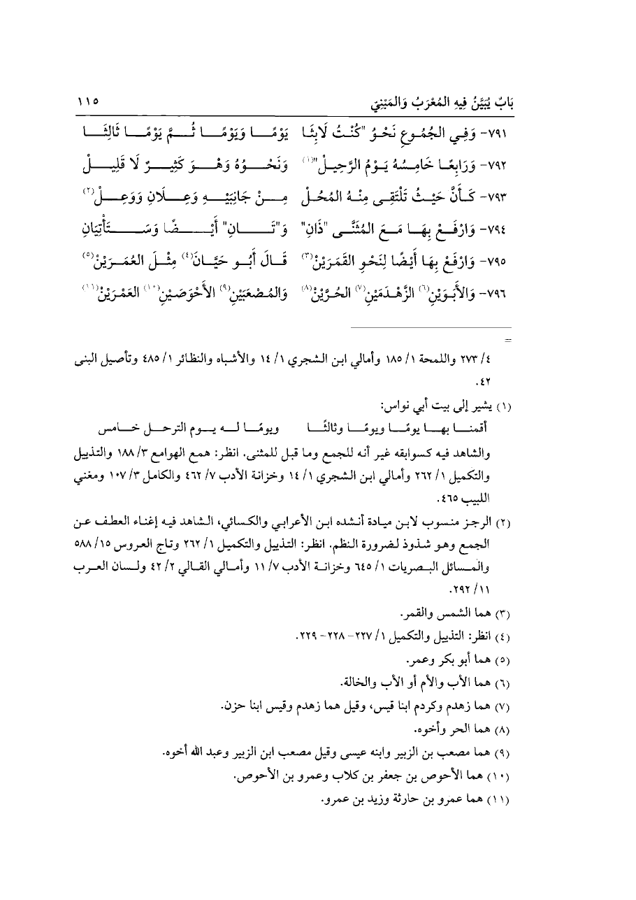 ٧٩٦ - وَالأَبَوَيْنِ (¬٦) الزَّهْدَمَيْنِ (¬٧) الحُرَّيْنْ (¬٨) ... وَالمُصْعَبَيْنِ (¬٩) الأَحْوَصَيْنِ (¬١٠) العَمْرَيْنْ (¬١١)