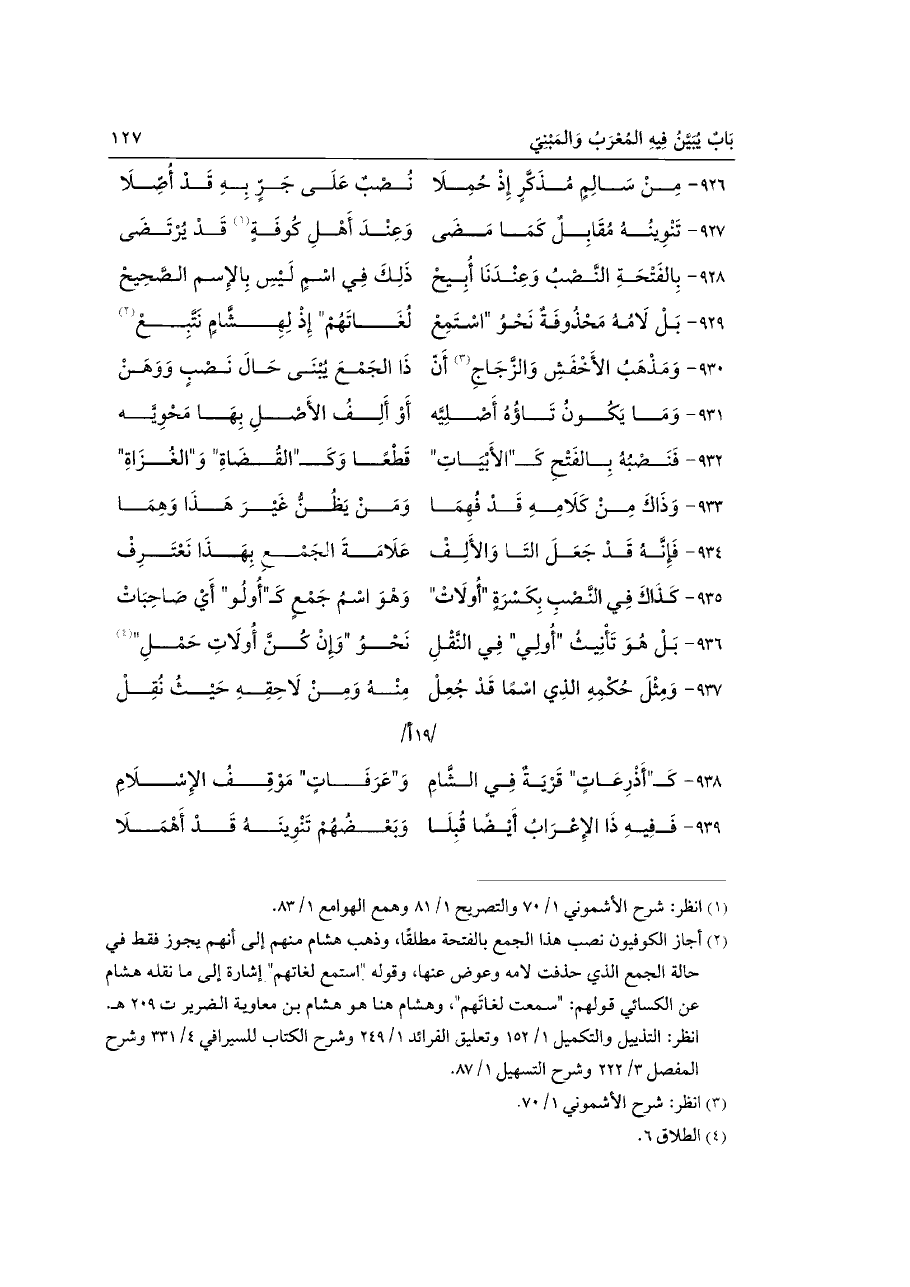 (¬٢) أجاز الكوفيون نصب هذا الجمع بالفتحة مطلقًا، وذهب هشام منهم إلى أنهم يجوز فقط في حالة الجمع الذي حذفت لامه وعوض عنها، وقوله "استمع لغاتهم" إشارة إلى ما نقله هشام عن الكسائي قولهم: "سمعت لغاتَهم"، وهشام هنا هو هشام بن معاوية الضرير ت ٢٠٩ هـ. انظر: التذييل والتكميل ١\ ١٥٢ وتعليق الفرائد ١\ ٢٤٩ وشرح الكتاب للسيرافي ٤\ ٣٣١ وشرح المفصل ٣\ ٢٢٢ وشرح التسهيل ١\ ٨٧.