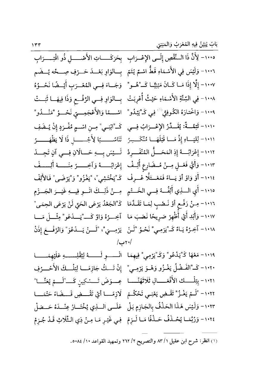 ١٠٠٥ - لِأَنَّ ذَا النَّقْصِ إِلَى الإِعْرَابِ ... بِحَرَكَاتِ الأَصْلِ ذُو اقْتِرَاب
