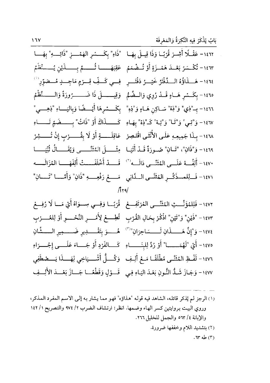 ١٤٧٣ - "ذَيْنِ" وَ"تَيْنِ" اذْكُرْ بِحَالِ القُرْبِ ... تُطِعْ لِأَمْرِ النَّحْوِ أَوْ لِلعُرْبِ