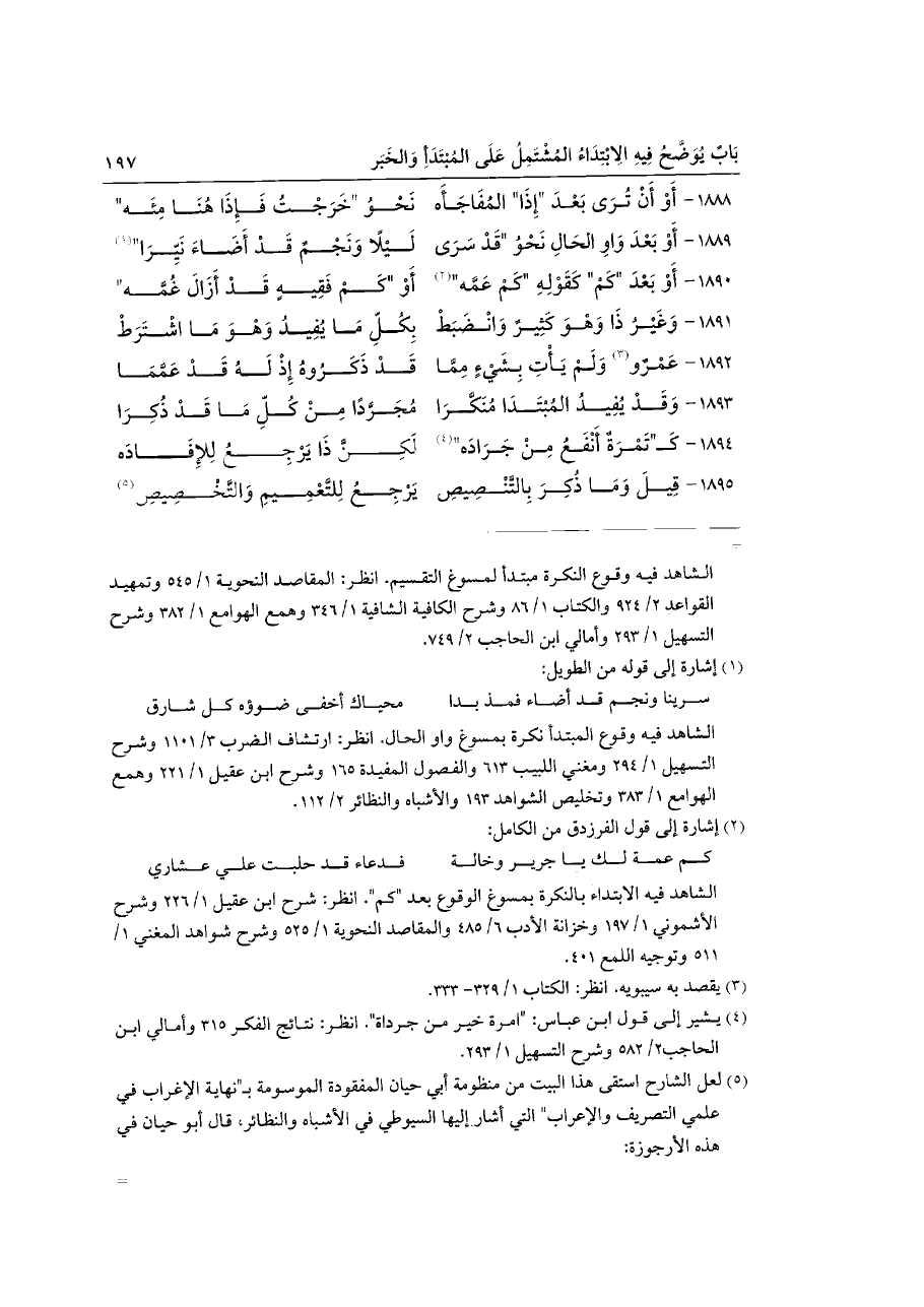 (¬٥) لعل الشارح استقى هذا البيت من منظومة أبي حيان المفقودة الموسومة بـ"نهاية الإغراب في علمي التصريف والإعراب" التي أشار إليها السيوطي في الأشباه والنظائر، قال أبو حيان في هذه الأرجوزة: