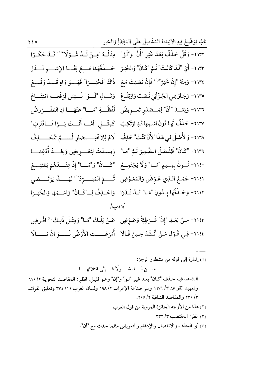 ٢١٤٢ - وَحَذْفُهَا بِدُونِ "مَا" قَدْ نَدَرَا ... وَاحْذِفْ لِـ"كَانَ" وَاسْمَهَا وَالخَبَرَا ... /٤١ ب/
