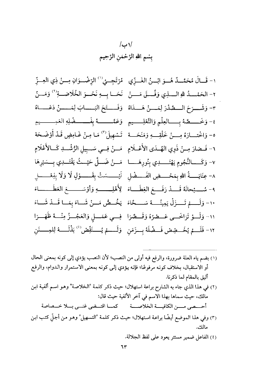 ٢ - الحَمْدُ للهِ الذِي وَفَّقَ مَنْ ... نَحَا بِهِ نَحْوَ الخُلَاصَةِ (¬٢) وَمَنّْ
