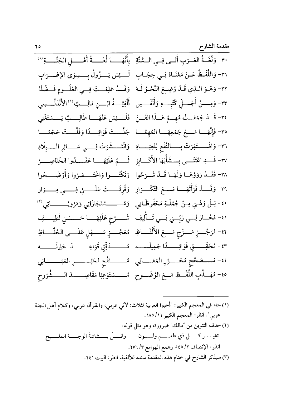 ٣٠ - وَلُغَةُ العُرْبِ أَتَى فِي السُّنَّةِ ... بِأَنَّهَا لُغَةُ أَهْلِ الجَنَّةِ (¬١)