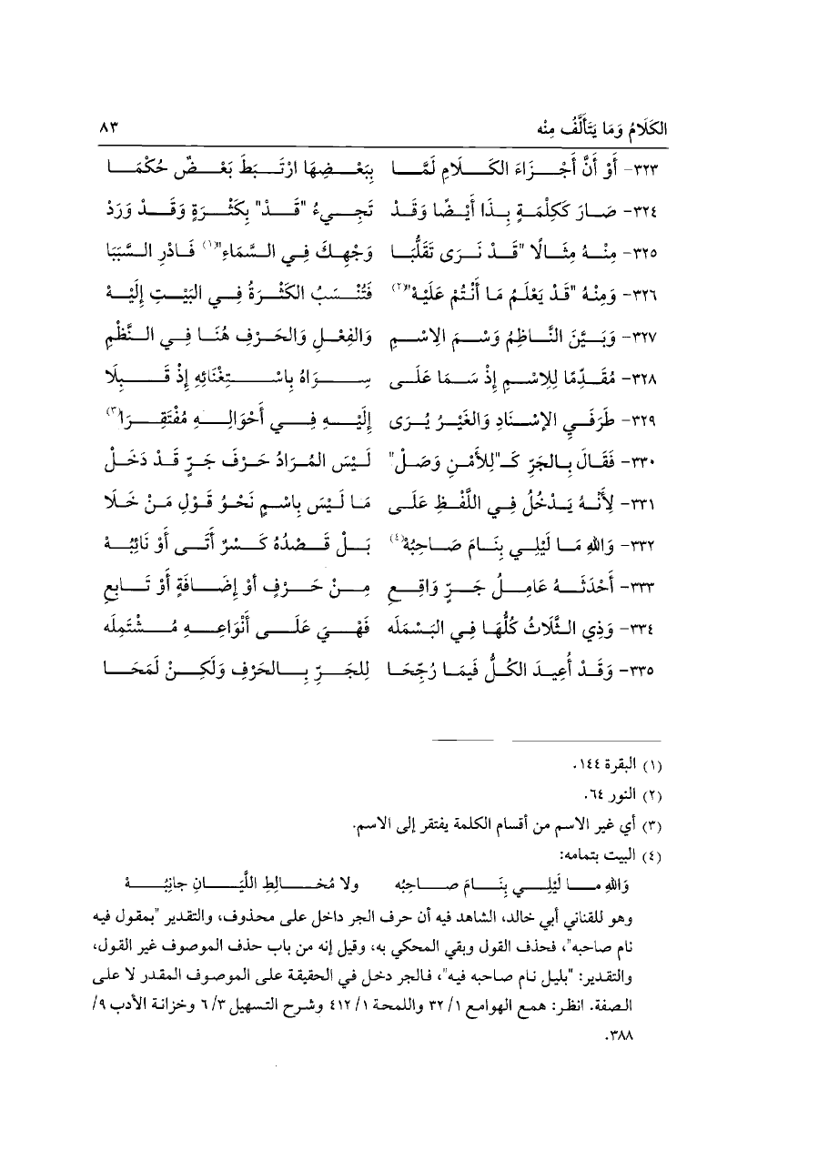 ٣٢٦ - وَمِنْهُ "قَدْ يَعْلَمُ مَا أَنْتُمْ عَلَيْهْ" (¬٢) ... فَتُنْسَبُ الكَثْرَةُ فِي البَيْتِ إِلَيْهْ