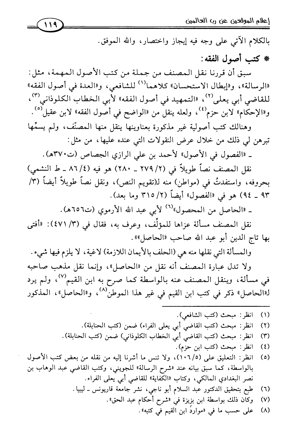 ولا تدل عبارة المصنف أنه نقل من "الحاصل"، وإنما نقل مذهب صاحبه في مسألة، وينقل المصنف عنه بالواسطة كما صرح به ابن القيم (٧)، ولم يرد لـ"الحاصل" ذكر في كتب ابن القيم في غير هذا الموطن (٨)، و"الحاصل"، المذكور