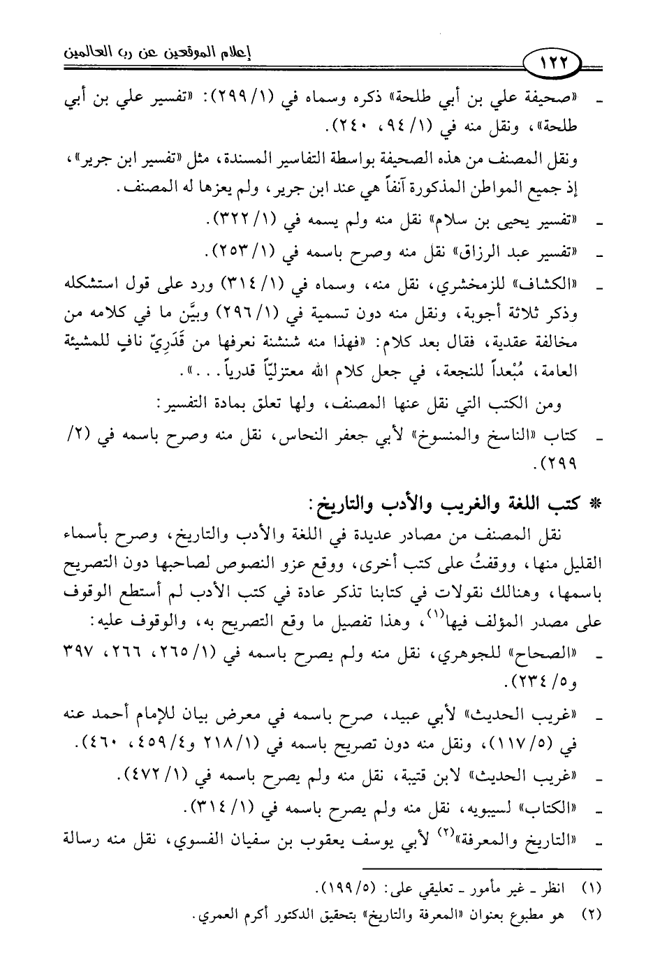 - "صحيفة علي بن أبي طلحة" ذكره وسماه في (١/ ٢٩٩): "تفسير علي بن أبي طلحة"، ونقل منه في (١/ ٩٤، ٢٤٠).