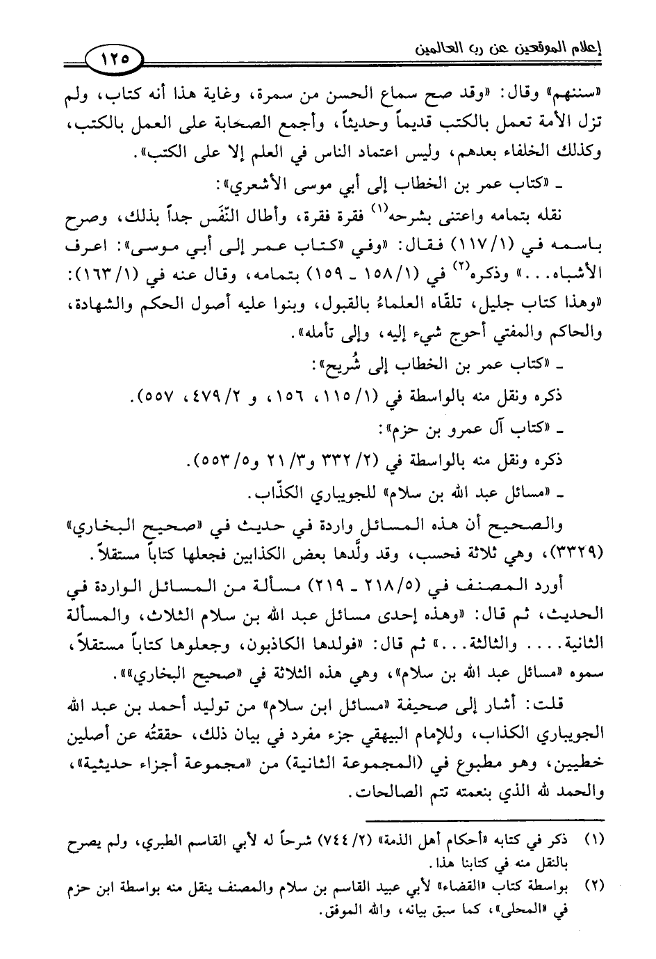 نقله بتمامه واعتنى بشرحه (١) فقرة فقرة، وأطال النّفَس جدًّا بذلك، وصرح باسمه في (١/ ١١٧) فقال: "وفي "كتاب عمر إلى أبي موسى": اعرف الأشباه. . . " وذكره (٢) في (١/ ١٥٨ - ١٥٩) بتمامه، وقال عنه في (١/ ١٦٣): "وهذا كتاب جليل، تلقّاه العلماءُ بالقبول، وبنوا عليه أصول الحكم والشهادة، والحاكم والمفتي أحوج شيء إليه، وإلى تأمله".