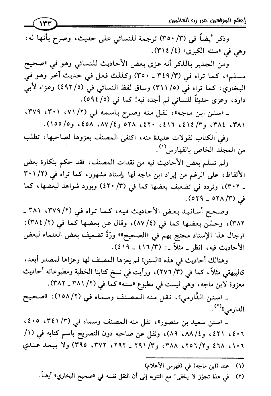 ومن الجدير بالذكر أنه عزى بعض الأحاديث للنسائي وهو في "صحيح مسلم"، كما تراه في (٣/ ٣٤٩ - ٣٥٠) وكذلك فعل في حديث آخر وهو في البخاري، كما تراه في (٥/ ٣١١) وساق لفظ النسائي في (٥/ ٤٩٢) وعزاه لأبي داود، وعزى حديثًا للنسائي لم أجده فيه! كما في (٥/ ٥٩٤).