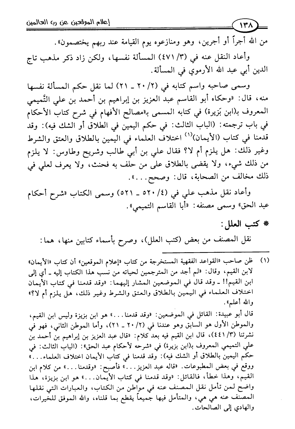 (١) ظن صاحب "القواعد الفقهية المستخرجة من كتاب "إعلام الموقعين" أن كتاب "الأيمان" لابن القيم، وقال: "لم أجد من المترجمين لحياته من نسب هذا الكتاب إليه -أي إلى ابن القيم!! - وقد قال في الموضعين المشار إليهما: "وقد قدمنا في كتاب الأيمان اختلاف العلماء في اليمين بالطلاق والعتق والشرط وغير ذلك، هل يلزم أم لا؟ " واللَّه أعلم".